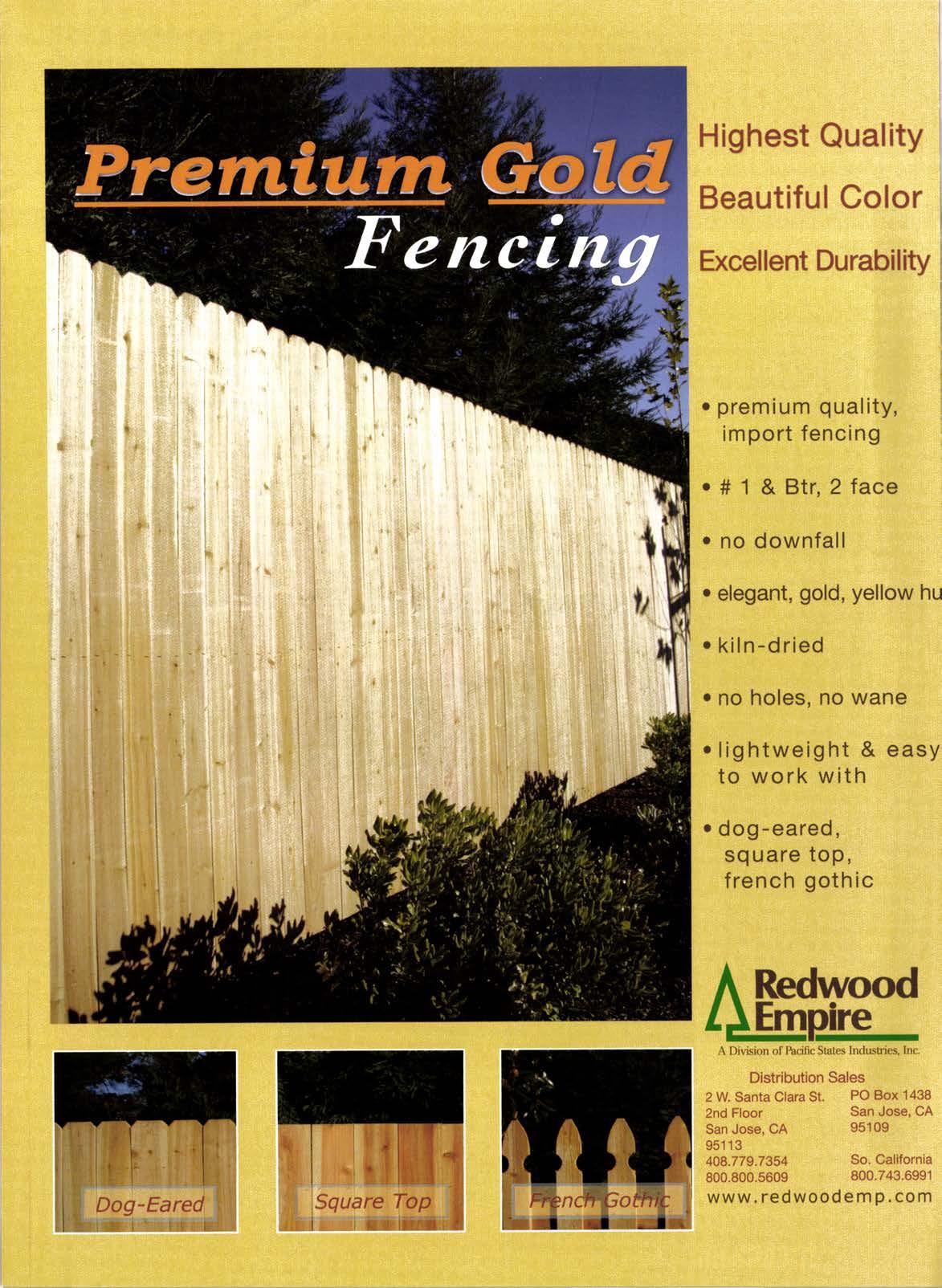 t il Highest Quality Beautiful Color Excellent Durability premium quality, import fencing # 1 & Btr,2 face no downfall elegant, gold, yellow hu kiln -d ried . no holes, no wane .lightweight & easy to work with o dog-eared, square top, french gothic Redwood pre l.'\ l)ivision ol llu:ilk Slrtcs ltttlttsb'it's, lttr: Distribution Sales 2 W. Santa Oiara St. PO Box 1438 2nd Floor San Jose. CA San Jose, CA 35109 95113 408.779.7351 800.800.5609 So. California 800.743.6991 Dog-Eared lirsl li'lll ',Square ToP i i ##i*g!#i* i. www. redwoode m p, com