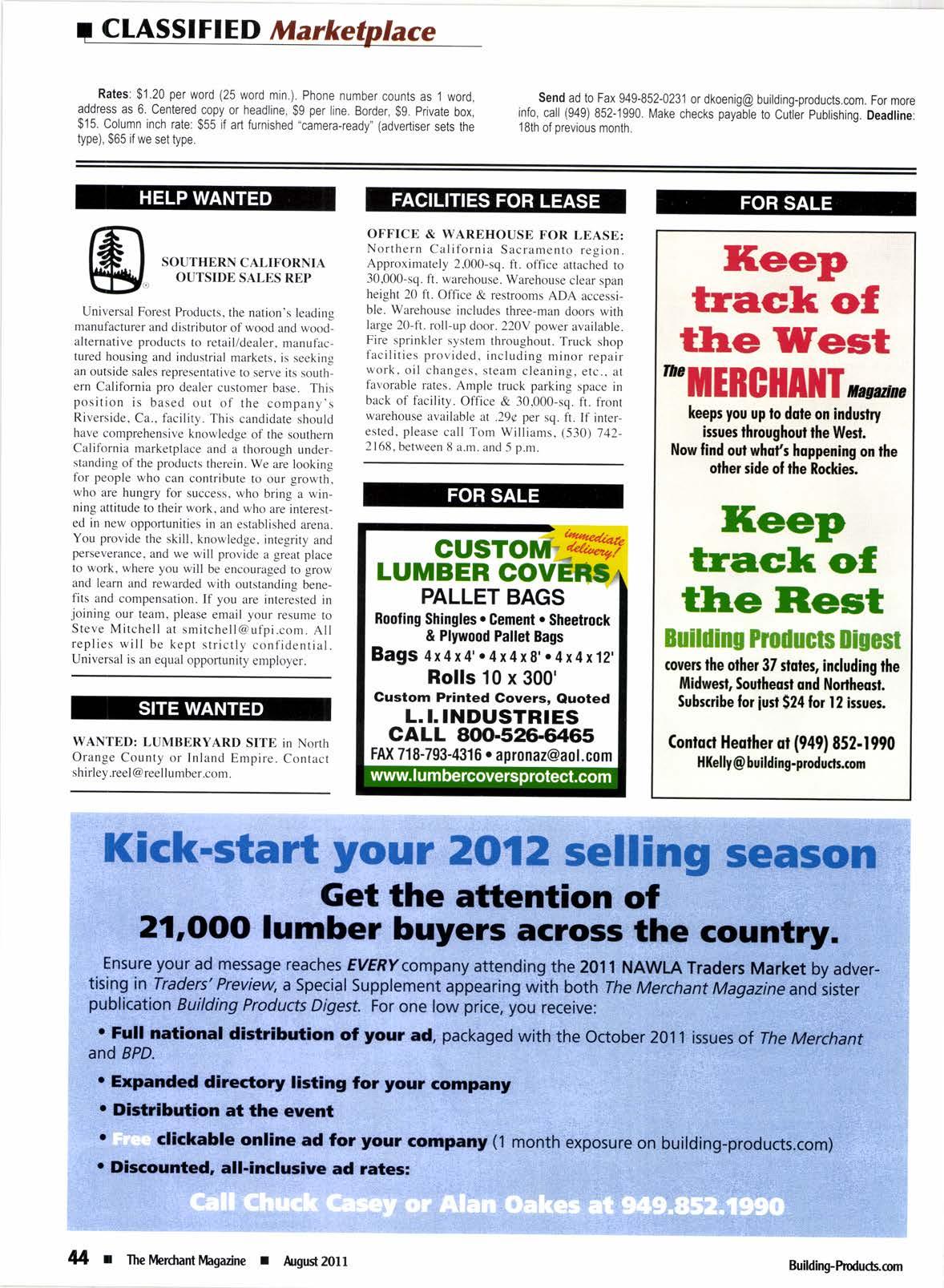 Universal Folcst Plorltrc{s. the natiolr's lcldin! iranufacturer anil distribLrtor o1' wo<ttl lrnd \ txrd altcrnativc producls lo rctail/clealer. rllrrulrc tured housing and intlrrstrial rrarkets. is sc'ckinl an outside sales rcl)rescnlirti\ c to ser\ c it: soutlr ern Clalilbrnia pr() (lcitl('r cu\tolt.tet base. 'l his position is based orrt oi lhe contpan\ s Rirersicle. Ca.. facilitr. -fhis canclidate sirould hiLvc contprehensir c knou lctlgc of thc sotrthcrr ('rLlilirrnia ntarketplacc untl a thorough under rlirntling t:rl the prodLrcls llrcrcin. Wc are ktoking lirr pcoplc uho can conlributc to our gro$th. uho rrc lrungry for succcss. uho hrinc a uin nins irltitudc to their gork. antl u ho are interestecl in rrcw opportunitics in alr cstublished arena. You proridc the skill. knoulcdgc. integritv and perse\crance. lrnci ue uill prrtritle a rrcilt placc [o u ork. rr hr.re r ou u i]l be cncoLrnrgetl to grorv and lcarn and reuarcled tith outslanding bcne fits and contpensation. lf you urc intcrested in joinrnt our ternt. pletse cmail voul resurlrc to Steve Mitchell at sntitchcllaoLrlpi.corrr. All replies will be kept strictlr conl idcnrial. Universal is un equal opportunit\ cnrplorcr..