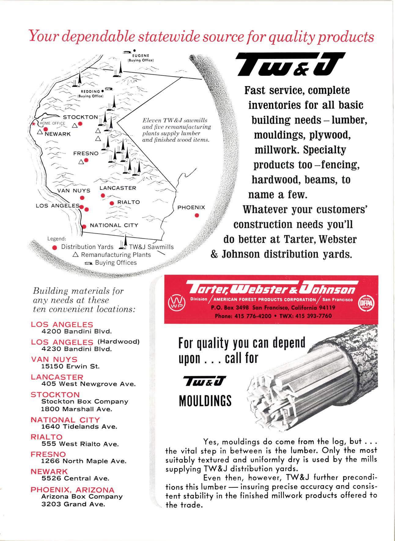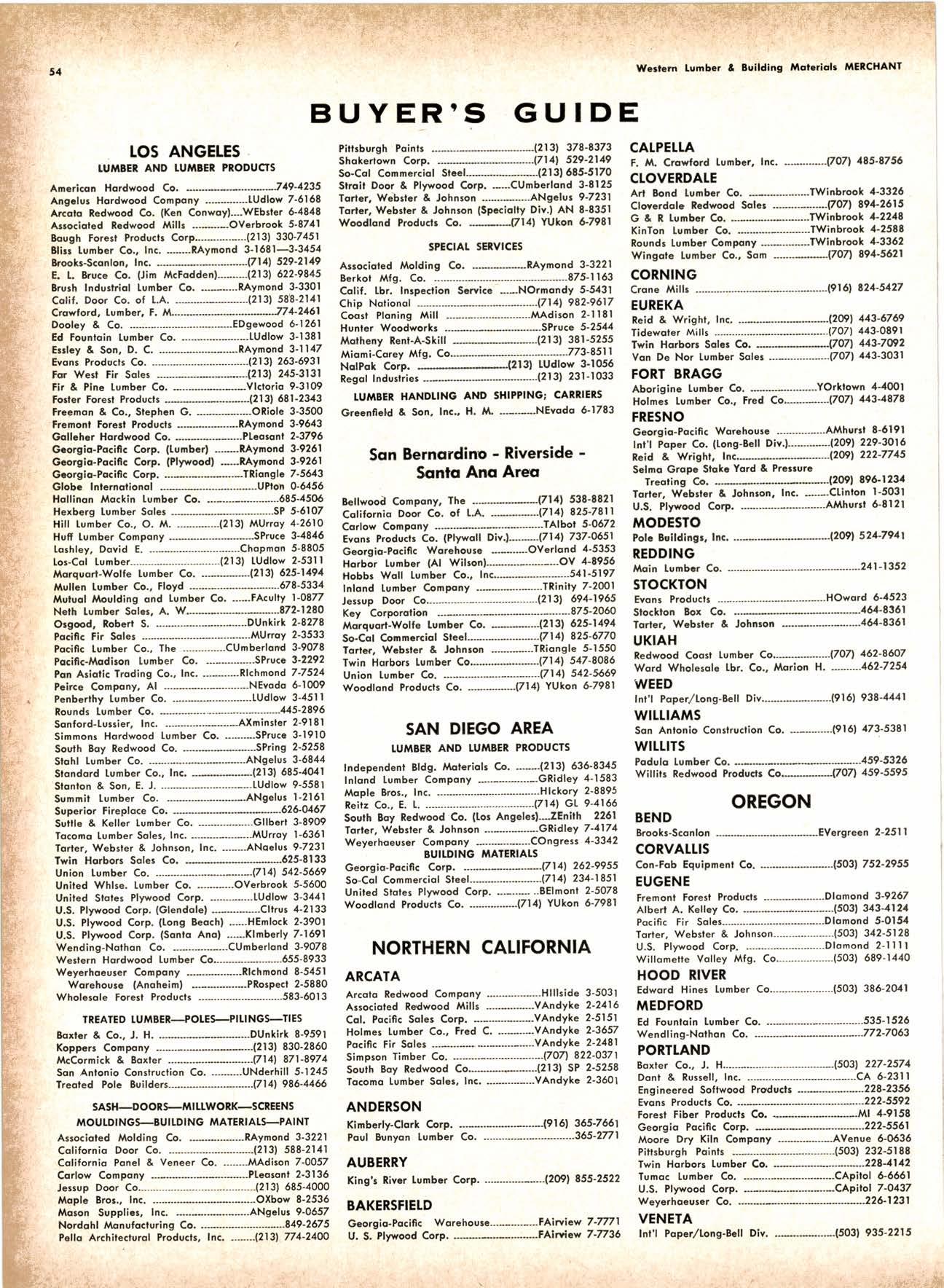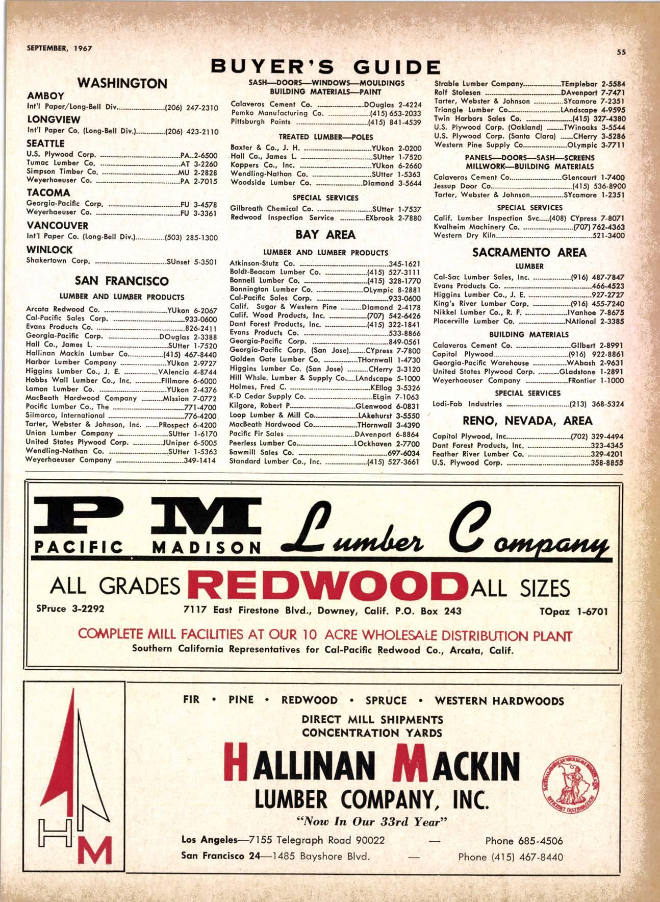 .-.---.*.---.DOuglos 2-1221 Pemko Monufocturing Co. --..---.-.......-...(415) 653-283 Pillrburgh Poinls -.-----.---....-----.--...---l,f l 5) 84 I -1539 TREAIED lUl,lBEl+OtES loxlcr & Co., J. H. Holl Co., Jonct L. Koppert Co., lnc. Yukon 6-2660 Wcndling-Nothon Co. .-.-...----.-..----..--.SUtcr l-5363 Golovcros Ccmcnt Co...--.-...-._-.........-Gtcncqrrf l-Z4OO t Woodsldc lumbcr Co. ------.--.---Dtonond 3-5644 Jesrup Door Co._____-".....-.--._..--_-._-_-.--.-._.(4151 536_E9q) .,:t.,: S'ECIAL SEIVICES fodcr, Webstcr & Johnron-..--.-----SYcomorc l-2351 , .,: Gitbrcoth chenicot co. ..._--_..--_--_-_-sUtfcr t-7537 spEcrAL sERvlcEs ii Rcdwood lnrpeclion Service ---..-.--EXbrook 2-788O Colif. Lunber lnspection Svc....-(4081 CYpres 7-8(71 "..$ Kvalheim Mochincry Co, ...-.-..-.--..-----VU/1762463 .J; BAY AREA Western Dry Kitn------.--.--.---.---.------..-.-.--:---.----52t-s4@ ".,LI IU'I^BER AND LUIIBER PTODUCI5 SACRAMENTO AREA Atkinson-Stulz Co. ----------------*-----.315-1621 tUfllBER Bofdt-Beocom lumber Co. -.------*--.(,{15) 527-3111 Bonnefl lumber Co. ---------#l5l g28-177O Col'Soc Lunber Soles, Inc' --'-'-'-""-"'(9161 187'70,,7 Eonnington lumber Co. .---.------.--_--Otympic g-2g81 Evsns Producls Co. .-.--------.------------------1e1523 col-Pocific soler corp. -- -..-- - -g33-0600 Higgins lumber co" J' E --927'a27 Cotif. Sugor & Wesicrn pine.-.-----Dtonond 21178 King's Rivcr Lumbcr Corp. ----------------(9161 155'7UA Cqfif. Wood Producfr, tne *-VO7l 5124y126 Nikkcl lunber Co', R' F. "'--""'-"---lVonhocT'8675 Danl Forest Producls, Inc. ..-....----...--..ilfSi 322.1811 Plocerville Lumbcr Co. ""-'---'-"-'.-.NAfionol 2-3385 Evons Producfs Co. -.--..---.--------..---------.533-8866 BUILDINC ,rlATERtAUt Gcorgio-Pocific Corp. .---..-----.--.-.-----------8,19-0561 ccorlio-pocinc corp. lson Jorcf........cyprest 7-78@ ::fi1,fflT:._11..._:_::_::_:-::::__::ii,i$'ir?-"?c1 Goldcn Gofe Lumbcr Co. ----r---.THolnwotl l-1730 c.orgio_pocifiG Worchoutc ...-.-_..---.-_-WAborh 2-9631 Higgins lumbcr Co. (Son Jorct .-.--.-.-CHcrry 3-3120 Unitcl Srqfcs plywood Corp...._.._.GLodrtonc l.2g9l Hill Whslc, Lumbcr & Supply Co.-...[Andrcopc 5-1000 Weyerhoeurer iorpony .-_-_-......-.-.....fnontier l_lOO0 Holmes, Frcd .C. ....---------..---------------KEllog 3-5326 K-D Cedor Supply Co. ---Etgi; 7-1063 SPECIAL SERVICES Kilgoro, Robcrt P..-.-..--.-.------..-Gtcnwood 6.083t todi-Fob lndusiricc ...-l2l3l 368-532.f loop Lumbcr & lrtill Co.-----LAldrurt 3€550 , lv{ocBeoth Hordwood Co..-.-.------....THornwott 3-4it90 RENO, NEVADA' AREA Pocific Fir Soles .-.-----.----------.-.----.-DAvenporr 6-8864 Copitol plyrood, lnc.-......___._..-._-_-..--VOZI 329491 Pccrlcrr lumbcr Co..-.--------------lOckhqvsn 2-700 Dont Forcit producfs, Inc. ..._________---___.-323-f3,t5 Sowniff solcr co. -.------*--.---..-,----69|7-(o31 Fcofhcr River lunbcr co, ---329J;zol Sfondord lumber Co., lnc. .--.--------J4l5l 527-3661 U.S. plywood Corp. -.-...--.----.-..-.--.*-.-----.-358-8855 PMN N pAcrFfc MADtsoN &JtnltQn \/ W ALL GRADESREDWOODnTT sPruce 3-2292 7ll7 Eosl Firestone Blvd., Downey, cotif. p.o. Box 243 SIZES TOpoz l470l CO'$PI.ETE MILL FACITITIES AT OIJR IO ACRE WHOLE9qG DISTRIBTJTION PIANr Sosthern Colifomio Representctives for Cal-Pqciftc f,edwood Co., Arcotc, C.olif. I F{I FIR . PINE . REDWOOD . SPRUCE . WESTER,N HARDWOODS DIRECT MILL SHIPMENTS CONCENTRATION YARDS '.it '."' !. :., ;idi., i; li;q,itti,,i,ii' t, ?lil HntuNAN frlACKlN TUMBER COftIPANY, INC. "Noto In Our 33ril Year" lor Angeler-7l55 Telegroph Rood 90022 Scn Frqncisco 24-1485 Boyshore Blvd. ' ,;: :lr. ;r\i. i'.u, r' , ,i..*,;ll.lil" t';;,:ililtii Phone 685-4506 Phone 1415]r 467-8440