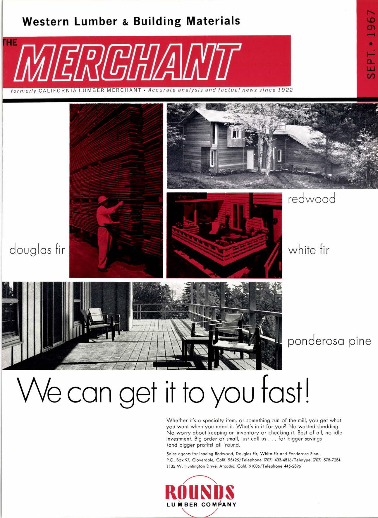 Soles ogenfs for lcoding Redwood, Douglos Fir, Whife Fir ond Ponderoso Pine. P.O. Box 97, Clovcrdolo, Colif.95425/Telcphone {702} 133-lllt/teletype 17071 578-7281 '1135 W. Huntington Drivc, Arcodio, Colif. 91006/Telephone 445-2896 ROUNIIS L U M BER CO IUI PANY \-/