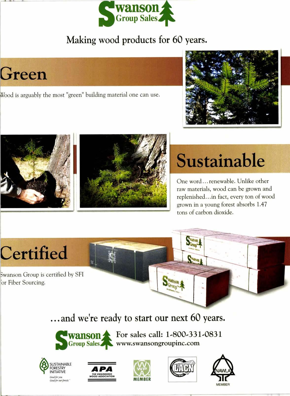 is arguably the most "green" building material one can use. i One worcl... renewable. Unlike other : raw materials, wood can be grown and , replenished...in fact, every ton of wood r grown in a young forest absorbs 1.47 ' tons of carbon dioxide. r" I ; -.*" i-fu+ iwanson Group is certified by SFI br Fiber Sourcing. ... arld wefre ready to start our next 60 years. G*anSOnA For sales call: 1'8.00'331'0831 ril Group SalesA, www.swansongroupinc.com E^l Arrrro,*or', YifiTffJ$I &wl{or pt 6*lfor tur|.Nni APA rHr fxctx(fPtowo6&fatr& MEMBER filtftlBtR