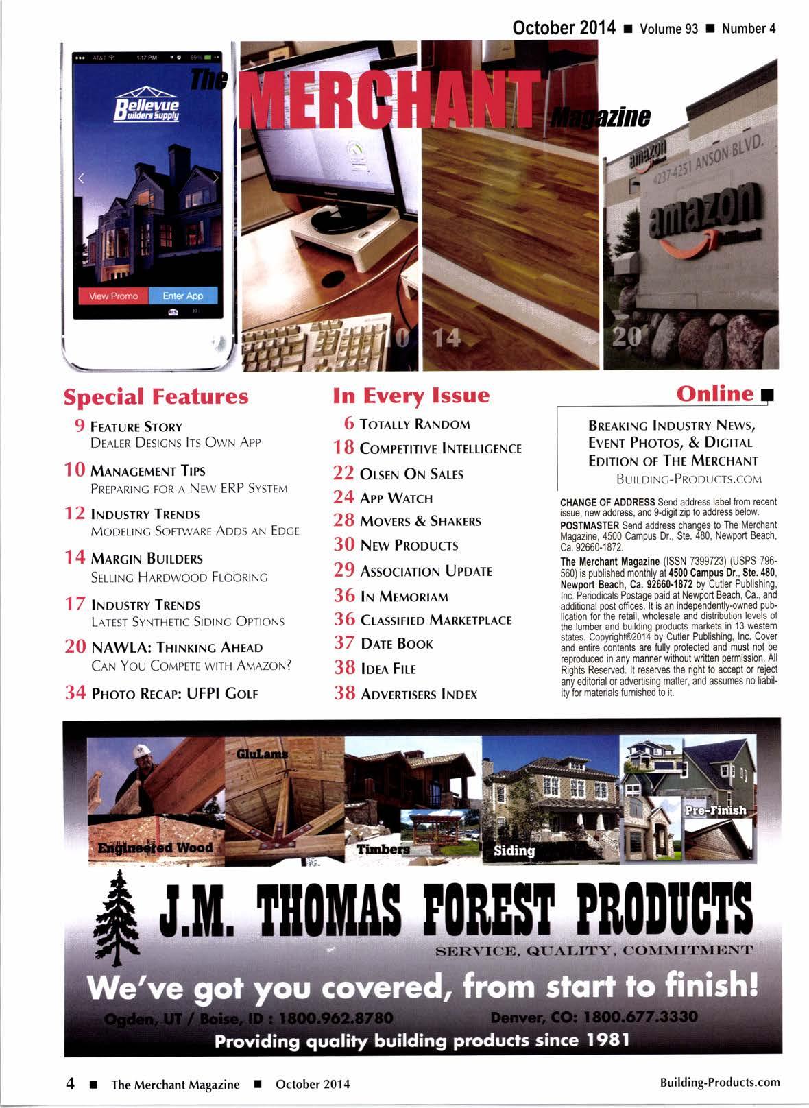 The Merchant Magazine (ISSN 7399723) (USPS 796560) is published monthly at 4500 Campus Dr., Ste. t180, Newport Beach, Ca. 92660.1872 by Cutler Publishing, Inc, Periodicals Postage paid at Newport Beach, Ca., and additional post offices. lt is an independently-owned publication for the retail, wholesale and distribution levels of the lumber and building products markets in 13 westem states. Copyright@2014 by Cutler Publishing, Inc. Cover and entire contents are fully protected and must not be reproduced in any manner without writlen permission. All Rights Reserued. lt reserves the right to accept or rejecl any editorial or advertising matter, and assumes no liability for matedals fumished to it.