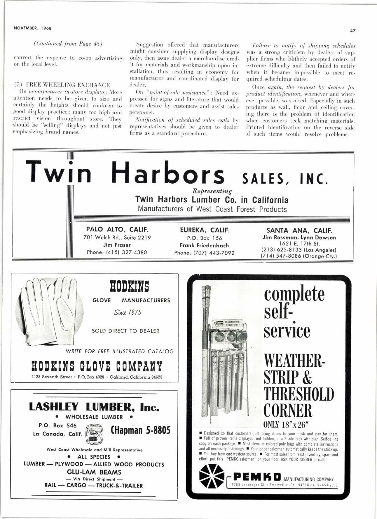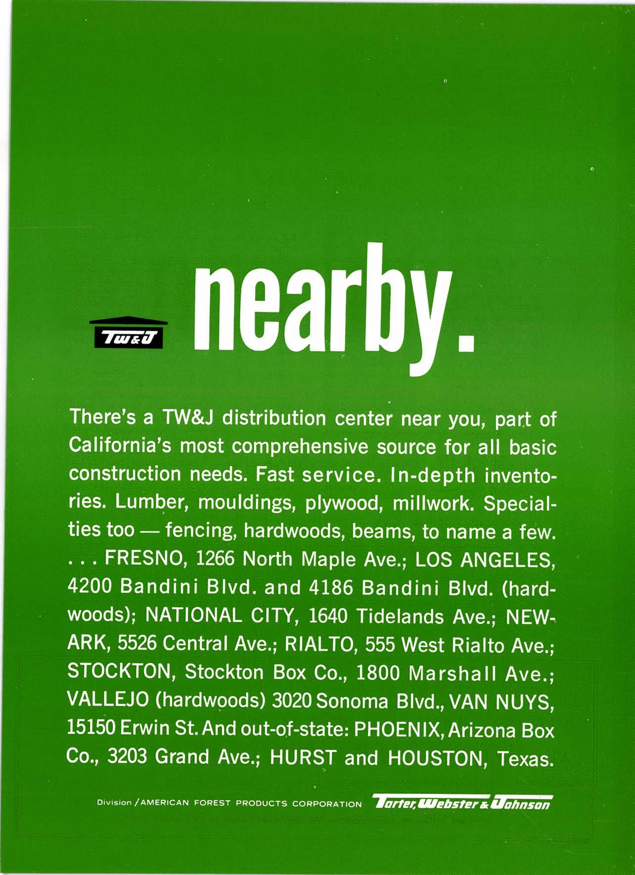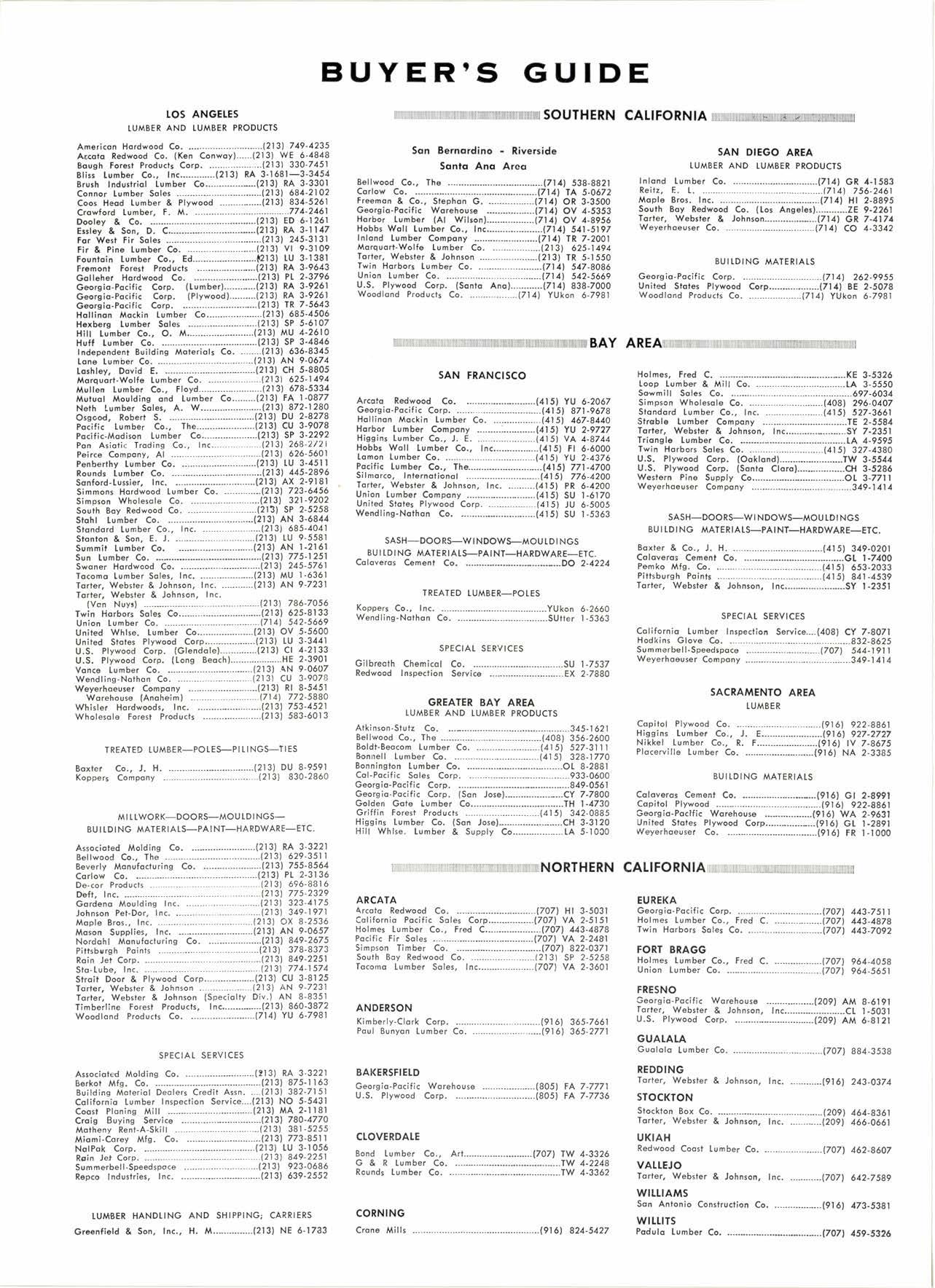 SERVICE IS OUR MOST IMPORTANT PRODUCT NEwmqrk l-8269 All Types fuIateri,al Handling Equiprnent JJ. Yn. Q-"",fi"/J €, Son, -9n,. 522 EAST WEBER AVE. O COMPTON, CAIIF. 9@22 NEvqdq 6-1783 THE KEY CORPORATION WHOLESALE LUMBER 191 N o. Lilac. Box 189' Rinho, Calil. Telephone Area Code 714 ' 875-2060 LetUs Prove This ls the Cort for You! Cqll orwrite for free brochure BERI(OI MA]IUFA(IURIIIO (OMPAIIY I1285 Goss Slreet, Sun Volley, Colif. Phone: 8TS-1163 OF HANDTING E. L. Rmrz CowANY HANK LOCY GIL LANGLEY BUD REITZ stNcE tsg(, (714) 756-2461 POST OFFTCE BOX 569 Wholesale Distributors of Lumber Products RANCHO SANTA FE CALIF, Kiln-Driad PINE WHITE FIR INCENSE CEDAR PTAGERVTTLE LUMBER GOMPANY P.O. Box 752, Placewille, Cqlif. Mqnufqclurers SPEGIALTZING TN ROOF DECKING Telephone: Ploccrville-NAtionql 2-3385 WHOTESATE oN[Y, PTEASE