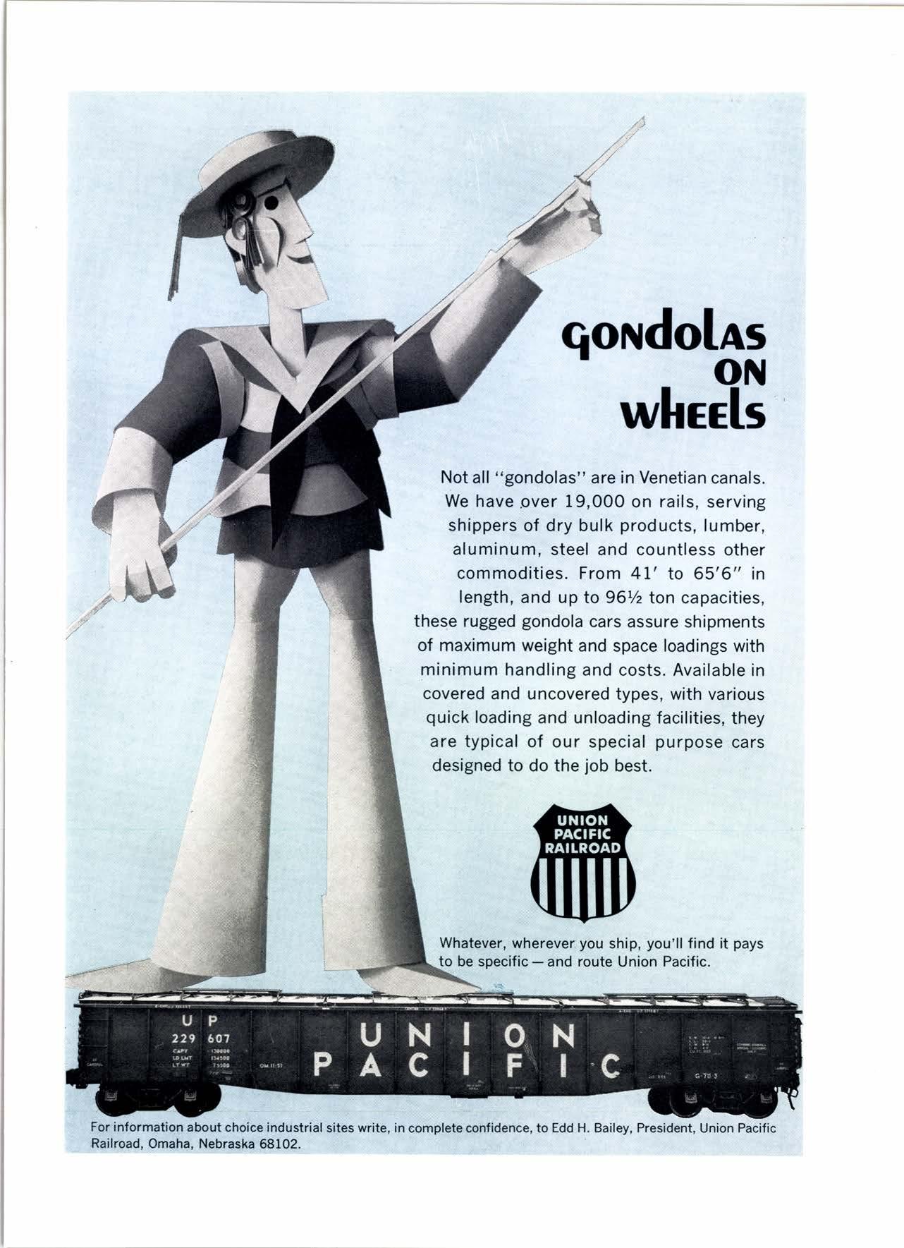 Not all "gondolas" are in Venetian canals. We have over 19,000 on rails, serving shippers of dry bulk products, lumber, aluminum, steel and countless other commodities. From 4L' to 65'6" in f ength, and up to 96Yz ton capacities, these rugged gondola cars assure shipments of maximum weight and space loadings with minimum handling and costs. Available in covered and uncovered types, with various quick loading and unloading facilities, they aretypical of our special purpose Cars designed to do the job best.