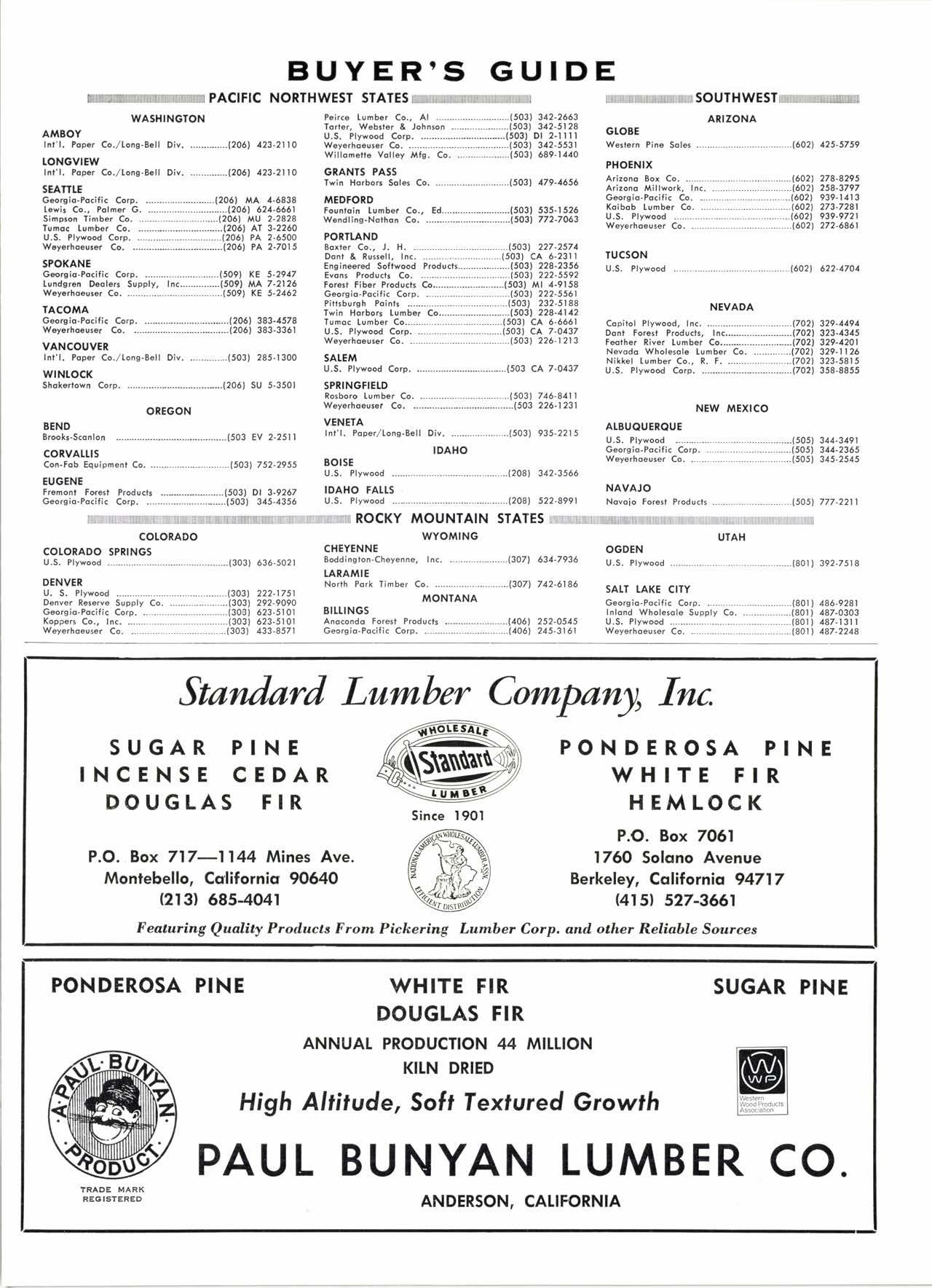 Co, ---.----,---,---.---,-.-.--,--------.-(503) 226-l 213 SATEM U.S. Plywood Gorp. .-..........--.......-..-....-...(503 CA 7 -0137 SPRINGFIETD Rosboro Iumber Co. ---.-------.------.....--..------.(503) 746-Bll I Weyerhoeuser Co. .---------...-.----..-.--------.-.-.(503 226-l 231 VENETA lnr'1. Poper,/tons-Bell Div. --..--....-.....-...-.(503) 935-2215 IDAHO |ll||||ll||||ll|||li|||il|||ll|||ll|||||l||||l|||||ilir5ouTHwE5Ttuuunnnnunuluruun ARIZONA GIOBE Weslern Pine Sqlc --..-.-.--.--..--...---.-.-.....-.--(602) 125-5759 PHOENIX Arizonq Box Co. --....-...----..-.-..--.....-.-.-..---..(602) 278-8295 Arizono Millwork, Inc. .--.--.....--...-.-.-..-.-.--.(602) 258-3797 Georsio-Pocific Co. -.-...-...-....--.--...-..--...---(602) 939-l,tl 3 Koibqb Iumber Co. -..-.-..-..-..-----.-.-----.------16021 273-7281 U.S. Pfywood .....--......-(6021 939-9721 Weyerhoeuser Co. --..-.,--,-,.----..,---------.---.-.-..6021 272-6861 TUCSON U.S. Plywood ,,...,......,.(602) 622-1701 NEVADA Copilol Pfywood, Inc, .-.-..--.--.-.-..-....----------(7021 329-1191 Donl Foresl P.oducls, Inc......-------------------(7021 323-1315 Father River Lumber Co....-........---..-.......17021 329-1201 Nevodq Wholesole [umber Co. --------.-.---(7021 329-11 Nikkel Iunber Co., R. F. .------.-.---...---.-.--(7O2) 323-5815 U.S. Plywood Corp. ..---.---.----------.-----------(7021 358-8855 NEW MEXICO ATBUOUEROUE U.S. Plywood ...-...-....--(505) 3,t,1-3,191 Georgio-Pocific Corp. -,.....-.,.-----.--.-.---..---..(5051 311-2365 Weyerhoeuser Co. .-,--.-.--......,---.--,----,---.....-(505) 345-2545 NAVAJO Nqvoio Foresl Prqducts .......--.----- -----.---.-..-.l5051 777 -2211 UTAH OGDEN U.S. Pfywood ,...-..-...--.-.t80ll 392-7518 SALT TAKE CITY Georgio-Pocific Corp. -.--.-..-.--.,---.--,---..-.---.(801 ) 486-9281 Inlond \ry'holesole Supply Co. --,---.,-,-----..-(801) 487-0303 U.S, Plywood .-.-.-,--,....-.(801) 487-13ll Weyerhoeuser Co. -.--....-.....,,-..,.,-,-----.,----.,(801 ) 187-2218 DENVER U. S. Plywood Denver Reterve Supply Co. Georgio.Pocific Corp. Koppers Co., Inc. ---..-.---.--Weyerhoauser Co. .-----.-----. ..............--....(3031 222-1 7 5l ..........._........-(303) 292-9O9O .._..._.._._...-._..-(303) 623-5101 ......_,...,....,....(303) 623-5r 0r ...,._......._.,._..(303) 433-857r