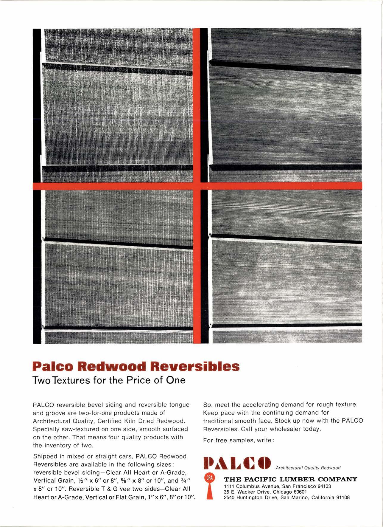 Shipped in mixed or straight cars, PALCO Redwood Reversibles are available in the following sizes: reversible bevel siding-Clear All Heart or A-Grade, Vertical Grain. 1/2" x6" or 8", s/8" x8" or 10", and 3/a" x8" or 10". Reversible T & G vee two sides-Clear All Heart or A-Grade, Vertical or Flat Grain, 1" x 6",8" or 10".