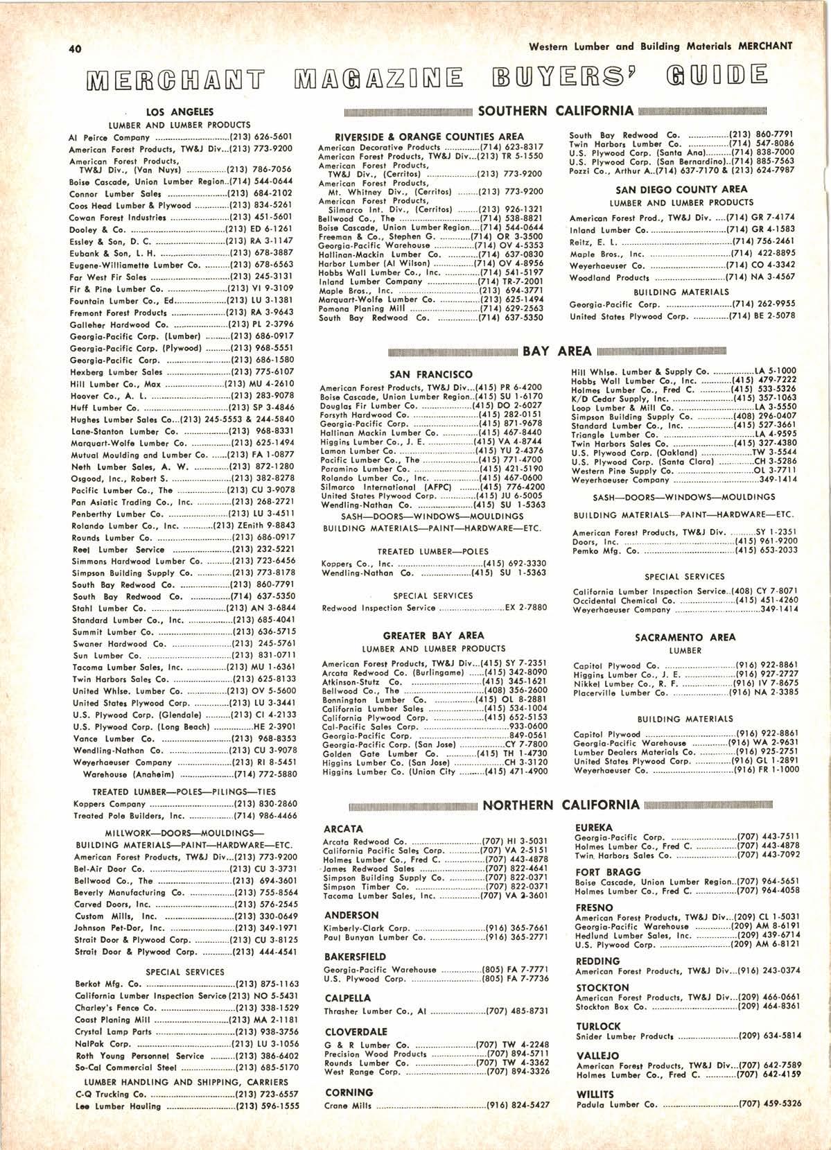 2-3601 ANDERgON Kinbcrly-Clork Corp. -.,--.--..-,.....-..,.-.--.-(91 6) 365-7661 Pqul Bunyqn lumbcr Co. -..-.--.-.-...--.--..-(9161 365-2771 BAKERSFIET"D Georsiq.Pocific Wqrehourc -.....--...-..--(8051 tA 7-777'l U.S. Pfyw@d Corp. .-..-.-..,...-..--.-..-...-(805) fA 7-7736 CATPETIA Throrhcr lumber Co., Al CTOVERDAIE - - --. -1707 1,485-823 | G & R Lumbcr Co. ........................17071 fW 1-2218 Pacirion Wood Producls --....--.--....-------(7071 89/t'571 | Roundr Lumbcr Co. -.---.---.----.-..--.--l707l lW 1-3352 Wat Ronec Corp. --..-..-..---...------.--.-.---.(7071 89,a-3326 CORNING Cronc lillltr ..............(916) 821'5127 South 8oy Rcdwood Co. .--.--..-.-.--.-{2131 860-7791 Twin Hqrborr lumbcr Co. .-------.-..--.-(71lal 542.8086 U.S. Plywood Corp. (Sonfo Anol....-..-.-(71,1) 838'7000 U.S. Plywood Corp. (Son Scrnordinol--(7l,ll 885'7563 Pozrl Co., Arthur A.-(714) 537-7170 & l2l3l 621'7987 SAN DIEGO COUNTY ANEA LulrlSEl AND IUMBER PIODUCTS Amrrion totorl Prod.. IW&J Dlv. ----1711'r G1 7'1171 lnlond tum,bcr Co'...-...'....-.----.--..-.-..-(714) GR'a'1583 Rcitz, E. L. ............-.(7141 756-2161 Mqple Bror., Inc. .................(7 | 11 122-889 5 Wcyerhoeurer Co. ....--.-....--.---.---.-.-..-.17111 CO 1-3312 Wodlond Productr -..--...-'-.-..-..'.---.-..(Zl4l NA 3''1567 EUItDING A,TATERIAIS Gaorsio.Pocitlc €orp. --.....-..,-......-.......17111 262-9955 Unilod Stot t Plyw@d Co.p. ......--.--..-l7l1l BE 2-5078 AREA Hill Whko. Lunbar & Supplv Co. .....-.------.-.tA 5'lOO0 Hobbr Wdt Lunbcr Co.. Inc. .-------..--(4151 179'7222 Xolnq [umbcr Co., Frcd C. .-----------{/al51 533'5326 K/D Ctdor Supply, In<. .-.......-.........-....(,al 5) 357'l 063 lop [umbcr & A,till Co, tA 3'5550 Simpron Euilding Supply Co. .--.-..,.,----(4081 296-0107 stondord tunbcr Co.. Inc. -'.-.---.--..-.---(al5l 527-3661 Tfiongl. tumbd Co. -.-.---.-.--....--.....-..-....-.-..fA 4-9595 Twin Horbon Sqtc Co, --..----------.-..---.-.(/al51 327.4380 U.S. Plywood Corp. (Ooklondl -..---......-.-...-.TW 3'55,4'l U.S. Plywood Corp. (Sqnto Cloro) ..-.-.....-..-CH 3'5286 Wcrfern Pine Supply Co. OL 3-771I Weyerhocurcr Compony -...--.....--.-.-..-...-........-.349-l4l,l SASH-DOORS-W| NDOWS-I OU tDl NGS 8U I !DI NG IAAIERIAI.S-PAI NT-HARDWARE_EIC. Anaricqn Forcri Producfr, TW&J Div. ..........5Y l'2351 Doorr, Inc. -......-..--.-l,al5) 961-9200 Pcmko A{fg. Co. ....--................--............(4151 653-2033 SPECTAL SERVICES Cotifornio Lumber Inrpcclion Scnicc.-(408) CY 7'8071 Occidsntqt ChcniGot Co. .._..---.....--.....-.(,il5) 1St-1260 Wcyerhocurr Compqny .--.---.-....--.-,..-..-.,-.....,-3,19' | 4l 4 SACNA'IAENTO AREA I. UMBER Copitol Plywood Co. .-,.-....-.--...-.......-...(916) 922'8861 Hissinr Iumbcr Go., J. E. -...--.-.-.---.,-.-.(9161 927'2727 Nikk6f IuDbcr Co., R. F. -.-.-...,-.-.......-(9161 lV 7-8675 Ploccryillc Iuhba, Co. ...---.......---.-..-.(916] NA 2'3385 BUItDING l,tATEtlAtS Copitol Plywood ......(916) 922-8861 cco.giq-Pqcific Wqchourc --....---.-.--(916l wA 2-9631 [umber D@ler! Moterioh Co. -.'.---.-'--..(9161 925-2751 Unit d Stot.r Plywood Corp. -...--.....-..(916) Gl l-2891 Wcyarh@urcr Co. .-..--..---.-.---.---.-.--.-..--(9161 Ft l'1000 N.ORIHERN CATIFORNIA EUREKA G@rsio-Po(ific Corp. .............--...-----.--(7071 113'7511 Hofm6 f.umbcr Co., Frcd C, .--.-.....------17071 143'1878 lwin. Horbo.r Solcr Co. -.......-...-......--'..(7071 113'7092 FORT BRACG Boise Corcqdc, Union lunbcr Rogion..(707] 96'a'5651 Hofmc! tumbar Co., Frcd g. --.....-..----..17071 964''1058 FRESNO Amori(on Forc5l Ptoductt, TW&J Div.-.(2091 Ct l'5031 Gqorgio-Pocific Wqrchourc --...----.-..-(209) Al't 8-6191 Hcdfund Lunber Solcr, Inc. -...-...--.-..--(2091 139'6711 U.5. Plywood Corp. ..................-....-....{209} AM 6-8121 REODING Americqn For.r, Product, TW&J Div..-{916) 213-0371 SIOCKION Americon For6t Produ<t!, TW&J Div.--(209) /466-0661 Stockion Box Co. .-.-.-.-..-...-..-......--.-.-..-.12091 464.8361 TURIOCK Snidcr lunbcr Productr -.--........-..---.----(2091 634'5814 VAITEJO Am.ri@n fqctt P.oducl3, lW&J Dlv.--(7071 612-7589 Hofma tumbq Co., Frcd C. ..-......-..(7071 612-4159 wlulrs Pqdufo f,umbcr Co. .....---.....-..-............17071 459-5?26
