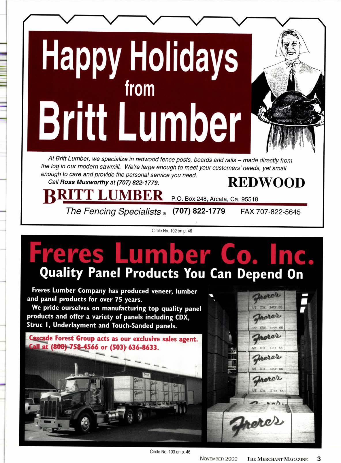 -1 .,|| -1 --.1 = -{ rt { = - 1 I l Circle No. 102 on p. 46--t 1 I --l i -.1 ---l l I I '1 I 1 I I I Il I At Brift Lumber, we specialize in redwood fence posts, boards and rails - made direcily from the log in our modern sawmill. We're large enough to meet your customers' needs, yet smal enough to care and provide the personal seruice you need. catt Ross Muxworthy at (707) s22-177s. REDWOOT) p.O. Box 24g, Arcata, Ca. 9551g The Fencing Specialists , VOT\822-1779 FAx7o7-822-s64s Foiest Group acts as our excluslve sales agent. 5 or (503)6364633. "'*h*_Circle No. 103 on p. 46 Novruaen 2000 Tnn MnncneNr Mlclzrtr 3
