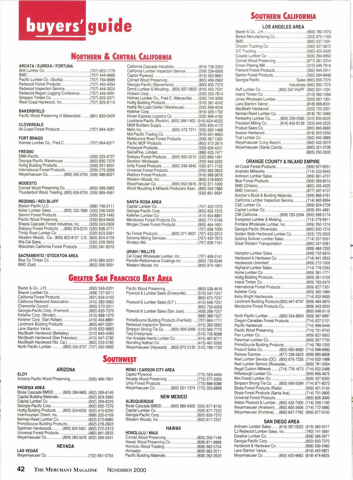 address label from recent issue if possible, new address and 9-digit zip to address below. POSTMASTER Send addres changesto The Merchant Magazin6, 4500 Campus Dr., Ste. 480, Newport Beach, Ca. 92660n872.lhe lvlerdrant Magazine, A California polqgration' (USPS 79S56000) is pubtished mo-nthly at 45f1 Campuo -0r., Ste. 480, Neilpolt Beach, C8. 926'{i}1872 by The Merchant Magazine, Inc. Periodicals Postage paid al Newport i]each,Ca.,andaiditiona|postot|ices'|tisanindependentlyownedpublicaliirn|orthere|ai|'wholesa|eanddistfibution westem staies. Copyrigh@dOO0 by The Merchant Magazine, inc. Covei and entire contents are fully protecled and musl not be reproduced in anJ manner without written permission. All Rights neservei. ttieserves the right to accept or reject any editorial or advertising matter, and assumes no liability for materials furnished to it. AMil?EACHABIE SERYICE FOR 0oug fir K'/D tx2-4x12 & targer Redwoqd l$D S4$ & Patterns Redwood uppers & commons Qedar lffD STK Re. $4$ & Patterns Cedar KII) C&Btr. Ro. $4S & patterns PRODUCT SRL€S CO. 2202N. Pacific (P.O. Box 4989), Orange, CA 92863-4989 (714) 998-8680. (800) 660-8680 , FAX714-921-8249 ^aR casTnilERs Since 1965 Circle No. 104 on o. 46 4 TnB Mnncn-txt Mlclznn NoVEMBER 2OOO