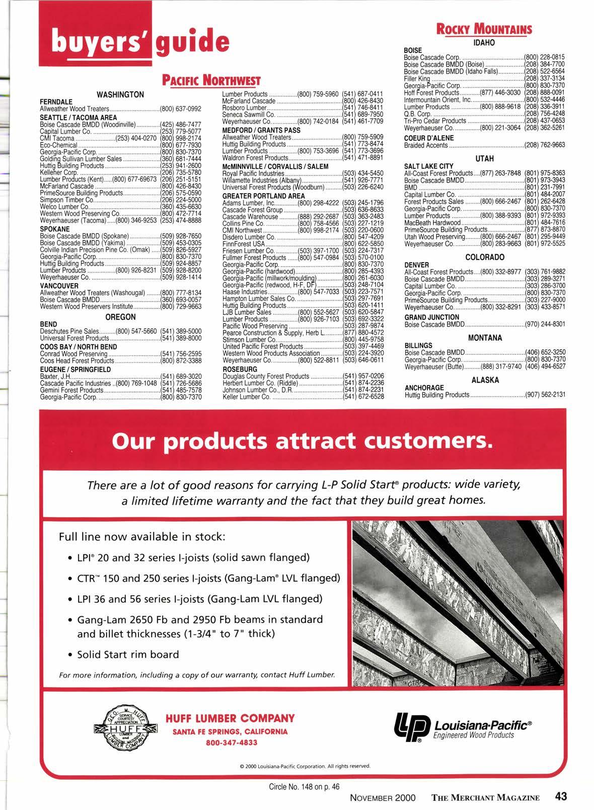 NOVEMBER 2OOO |!g:: .-=-*.ppd ftgrn W.egr Record U.S. demond spurs rising oroduction of western lumber. A eertilied suce$ co[tins pine reopr irsuttt ol 60 yeors of sustoinoble forest m0n0gement. living in slrow houses Ponel moken turn to ogrifiber. Insuhtion soundt oilf Noise control becomes o oowerful
