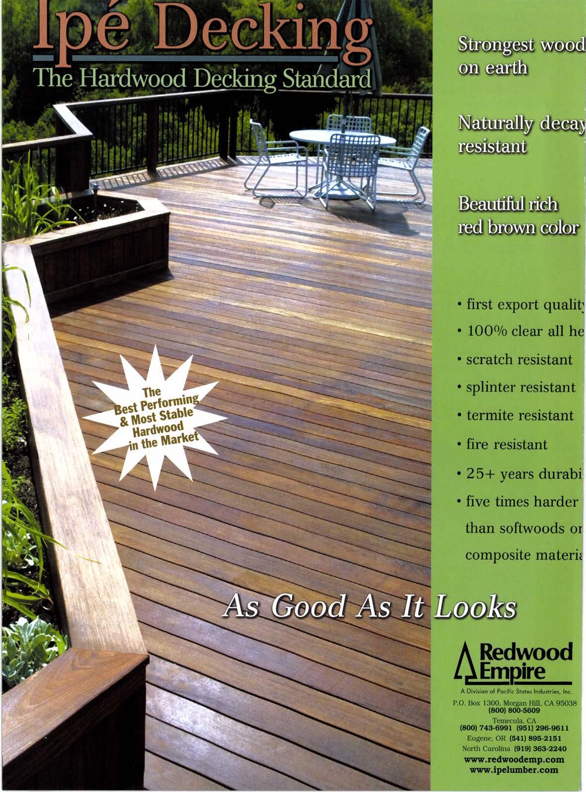 ! t!'.!F**.4 $r,rus*gc*x{ *vrm-nui *,r* g.€!-f.Lh: '':p *1.1 1_x_ri1[-h; Ceoea; ;".firy-a*t#g:*j $i.Ka:xns&ij vsf|.1 s.gg} g*,ugxv* er,;Jur first cxport clualit. 1000/cr clear all hc scratch rcsistant splinter resistant termite resistant fire resistant , 25+ years durabi . five times hardcr than softwoods or composite materit ,f ,I J-#Si(S A Redwood /JEmrc_ A l),virlon of Pa.lri. Sraier lr,{'.tries lnc I'.0. Ilox llJ00. Mofeiin Ftil1. CA 9503E (800) 800-5609 l'cmrculir. CA (8O0) 743-6991 (95r) 296-96rr Lhgene. Ofl (54f) 895-2f 51 North Carolina (9f9) 363-2240 www.redwoodemp.com www.ipelumber.com