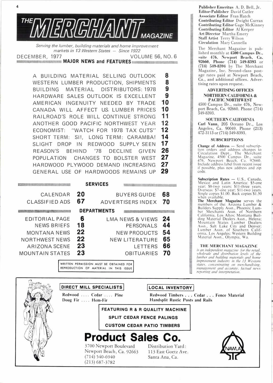 The .Ilerchant Magazine serves the members of the: Arizona Lumber & Builders Supply Assn.. Phoenix: Lumbcr Merchants Assn. of Northern California, Los Altosl Montana Building Material Dealers Assn., Helena; Mountain States Lumber Dealers Assn., Salt Lake City and Denver: Lumber Assn. of Southern California, Los Angeles: Western Building Material Assnl, Olympia, Wa.