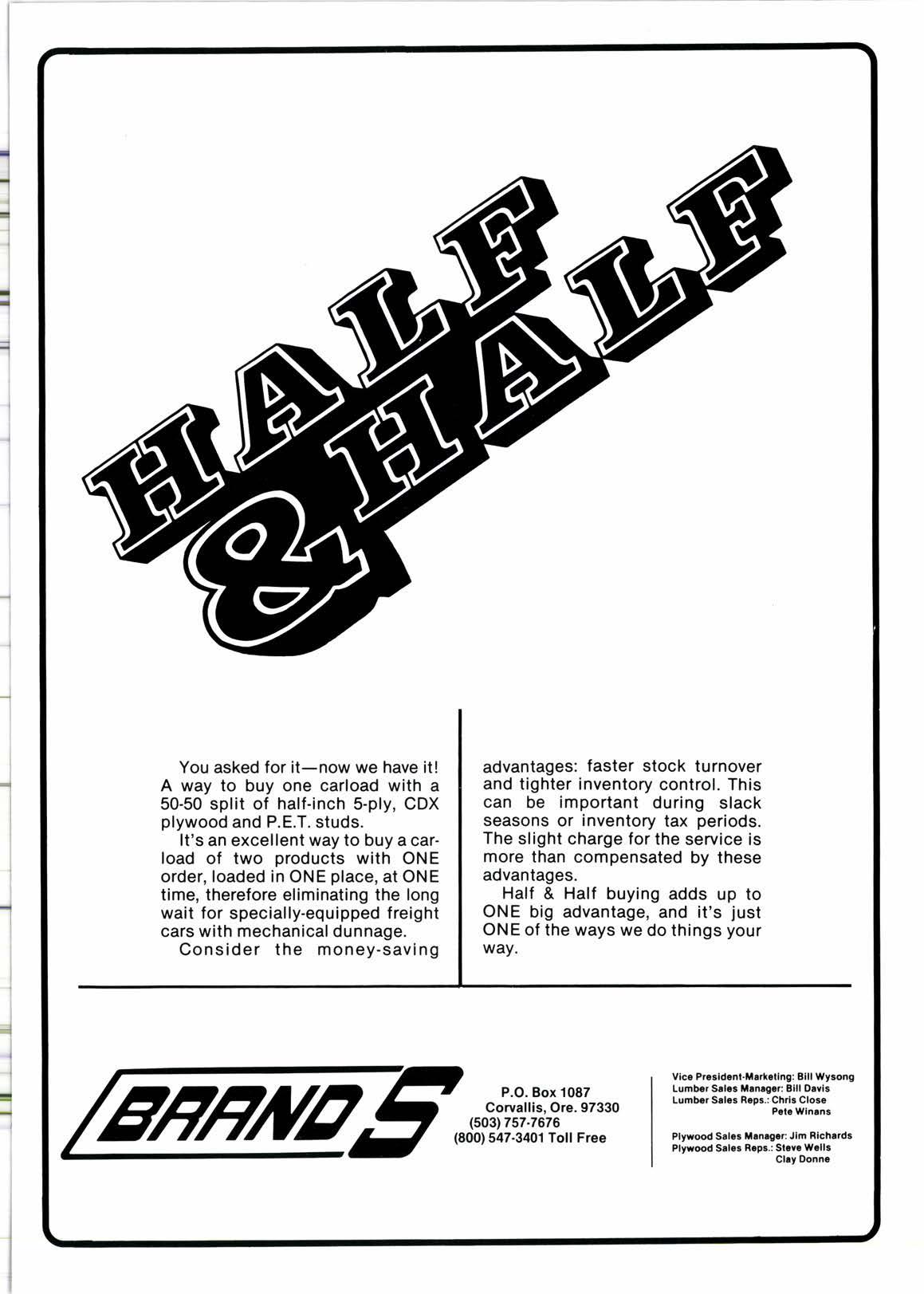 December. 1977 69 .(503) 644-2425 .(503) 383,1 901 .(503) 267-2r93 .(503) 752-0123 (800) 547-3401 .1503]. 747-7771 -SoUTHWESTARIZONA PHOENI X ArizonaMillwork.lnc...... (602)258-3i97 CaoitalLumber0o. (602) 269'6225 OavidsonPlywood& LumberCo. (602) 942-7398 FremontForestProducts. (602) 931-7479 GeorqiaPacificCorp. (602) 939'1413 Glob; lnternational ol Ariz. (602) 252-5854 (6021 258'4941 SoellmanHardwoods '602]. 272'2313 ViroiniaHardwoodCo. (602) 252-6818 IDAHO 80tsE ArmstrongBuildingMaterials.., Georgia.PacilicCorp. Louisiana Pacilic Corp. {Coeur d'Alene) Union Pacific Railroad tEwtsT0 N Union Pacific Railroad MERIDIAil Beall Lumber Co.. POCATE t TO Union Pacific Railroad NEVADA RENO CapirolPlvwood,lnc. NevadaWholesale Lumber Co. Union Pacific Rarilroad NEW MEXICO ATEU OUER OU E Ameilcan Foresl Products. Capital Lumber Co. DukeCityLumberCo.,Inc. Georgia-PacificCorp. Justus Lumber Sales NewlllexicoTimberProducts Frank Paxton Lumber Co. Sagebrush Sales |.2081 375-6222 (208) 343'4963 (208) 667-8441 (208) 345-4140 . '208]. 143-2524 .(208) 888-5454 (208) 232-4450 (505) 345,2541 15051 811-7222 {505) 842-6000 '50il 242-2151 (503) 242-7349 (505) 268-3928 {505) 243.7891 (505) 8i7-7331 .(702) 32S4494 . .(i02) 329-1126 .(702) 323-4881 -t ..(503) 679-5611 ..(503) 863-3796 (503) 342-3663 (503) 686.2911 {503) 345-4356 (503) 342-2636 (503) 686.il78 (503) 342-65i9 (503) 345-8461 . (503) 635-364r (503) 342-5128 Fountain LumberCo.,Ed... .......{iAil iq!'19?q MedfordCoro.......... ....(503)773'7491 lJnionPaciliiRailroad.. ......(503) 7735388 WendingNathanCo...... ....(503) 772'7063 PO RTLAN D 0ant&Bussell,lnc. ....(5Sil ??1''!Q44 Far west Fir Sales. .(5031 2564710 Georgia'PacilicCorp..... .....(503) 222'5561 HamfitonLumberSales ........{503) 223'6271 lnlandLumberCo...... .....(503) 292'917,| Louisiana-PacificCorD.. ....(503) 221-0800 IoJiiiinipailticc0rb.{Beavenon) ....(503} 6434861 Lumber Products (503) 223'8171 Northwest Hardwoods, Inc. (503) 248-9200 PacificstatesTransport (503) 638-7526 Pacilic Yard Seryice .(503) 234'9201 (503) 620'1411 ParaminoLumberco. (503)223'1341 Pope&Talbot,lnc- (503) 228'9161 SunriseForestProducts...... {503) 297'4551 LJnionPacilicRailroad.. (503) 288'8221 WesiCoastlumberlnsp.Bureau.. .. '5031 292'4418 -1 l (406) 245-3r36 (406) 792.2389 (4061 161-3222 (406) 452,6419 (406) 728-4770 (80r) zE 74S (801) 394-571 | (80r) 394,2671 SATT LAKE CITY Bunon.WalkerLumberCo. Capitol Building l\4aterials. Georgia-PacificCorp. lmperial Wholesale Koch DistriburinqCo. MacBeath Hardwood. UnionPacific Railroad. ... WYOMING CH EYEl{iIE Retail-DealerSupply, Inc. WyomingContractSupplies. (801)394-2671 (801)486-8778 (801)486-9281 (801)972-5656 .... (801)328'8791 .... {801)484-7616 (801)363.1544 .(307) 634-7936 .(307) 634-9534