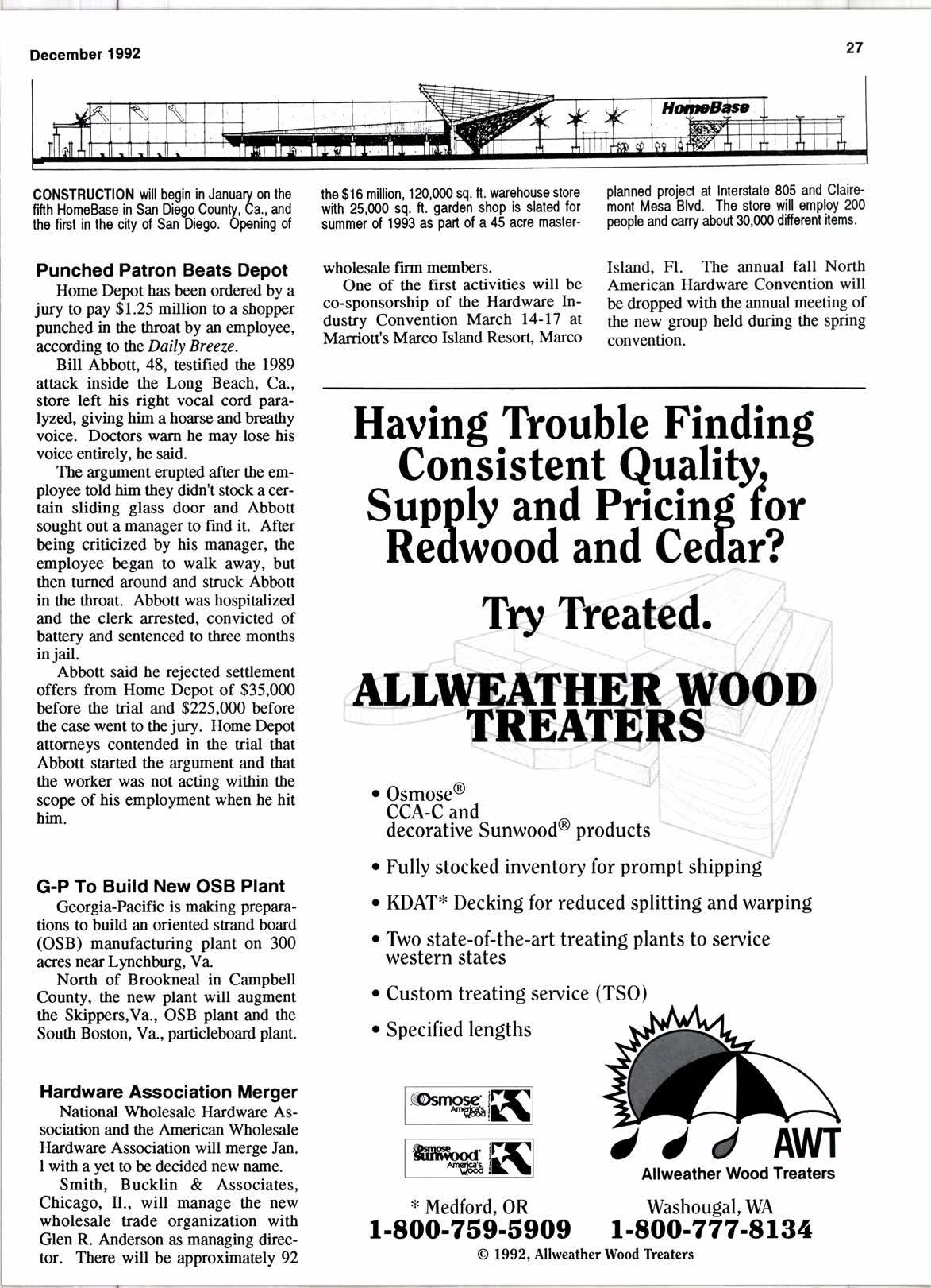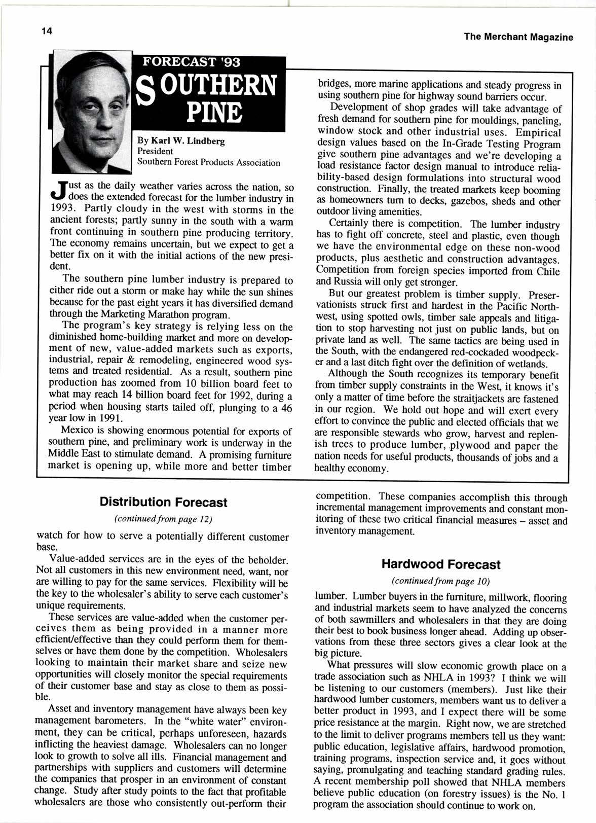 Spring '93 will see gradual improvement in housing and related market sectors, including treated wood product sales. High hopes for "change" could translate into general consumer confidence and renewed spending. Couple this with pent up demand for housing after three weak years and we can be mildly optimistic.
