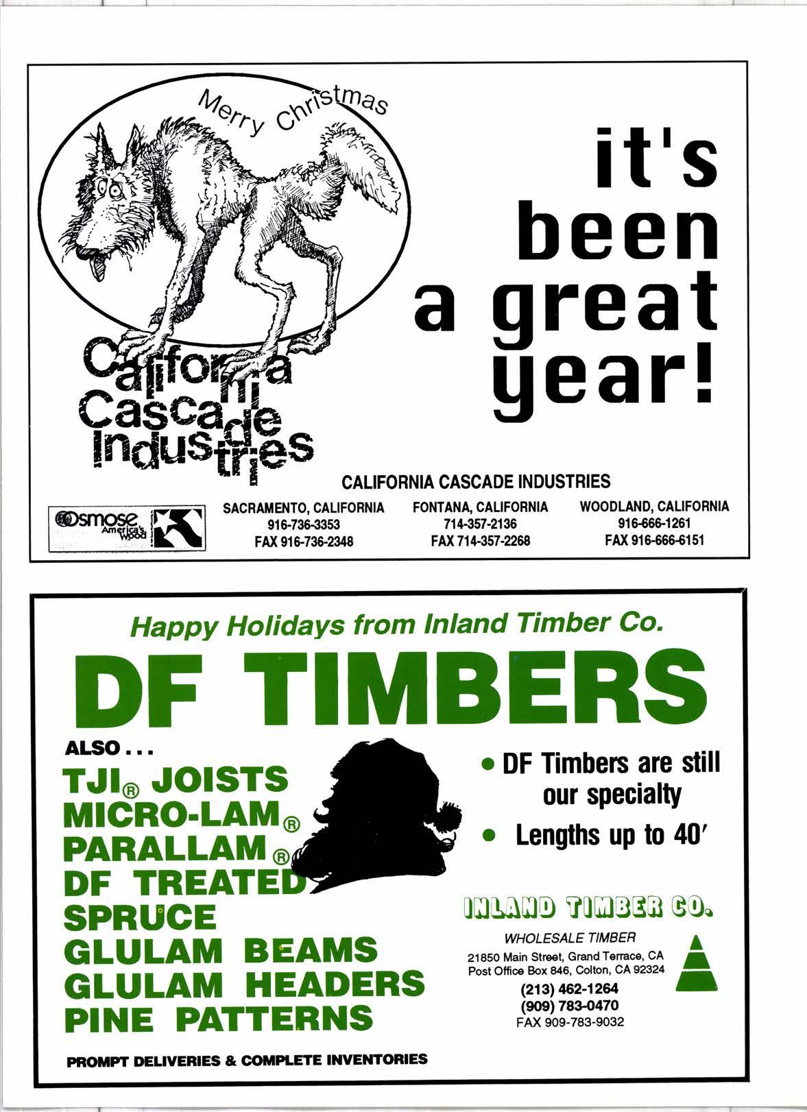itrs been a great Uear! CALIFORNIA CASCADE INDUSTRIES sAcRAmEl{TO,CALIFoRNIA FONTANACALIFORNIA WOODLAI{D,CALIFoRNIA 91e73&3353 714€57-2136 91646&1261 FAX 91&73&2348 FAX 714-357-2268 FAX 916-6666151 O$nose -T'&B Happy Holidays from lnland Timher Co' AII DF TIMBERS AlscD. .. TJI@ JOISTS MlcRo-LAM@ PARALLAM DF TREATE SPRUCE GLULAM BEAMS GLULAM HEADERS PINE PATTERNS PNOTPT DELIVERIES & OO]TPLETE INVENTORIES o DF Timbers are still our special$ o Lengths up to 40' 0nuAaD E0mtstsB G0. WHOLESALETIMBER 21850 Main Stpet, Grand Temace, CA Post Office Box &46, Colton, CA 92324 (213) 46,2-126/(goe) 783-0470 FAX 909-783-9032