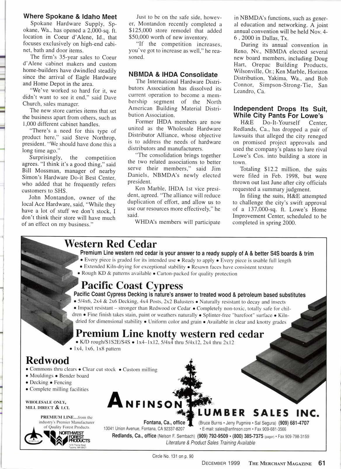 HUFF TUMBER COMPANY SANTA FE SPRINGS, CALIFORNIA (8oo) 347-4833 Circle No. 108 on p. 90 THr MBncHarr N{.rc,rzlse Decrvern 1999
