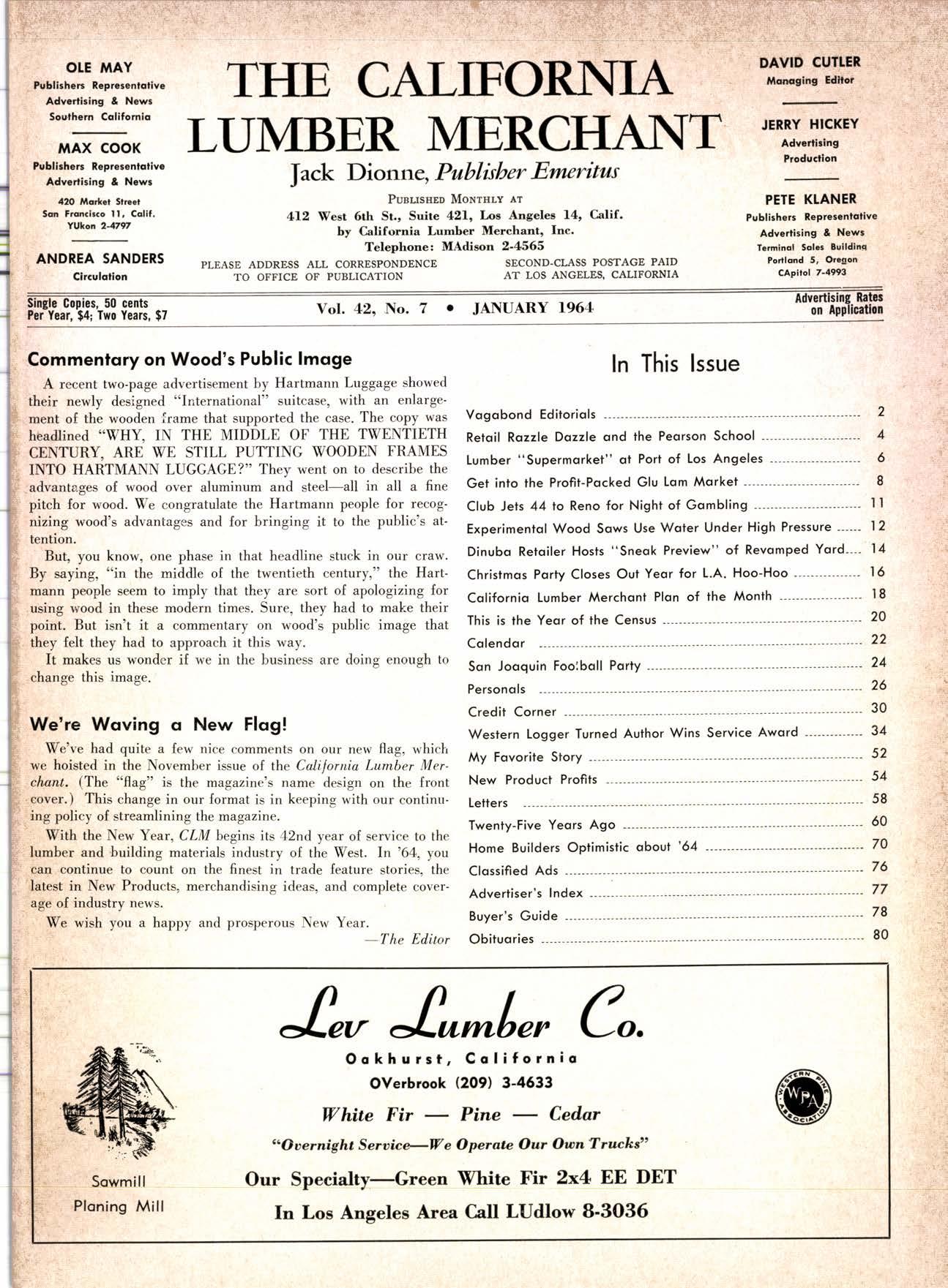 With the New Year. CLU Lreeins its l2rrrl vear of st'nict,to tht' lumber and builcling materials irr,lrrstrr- oI thc West. In '(r.1" r'ou can continue to <rourrt on the finest in traile feature storit's" the latest in New Pro<lucts^ merchandisirrg idt'as. and complett) (overage of industry news.
