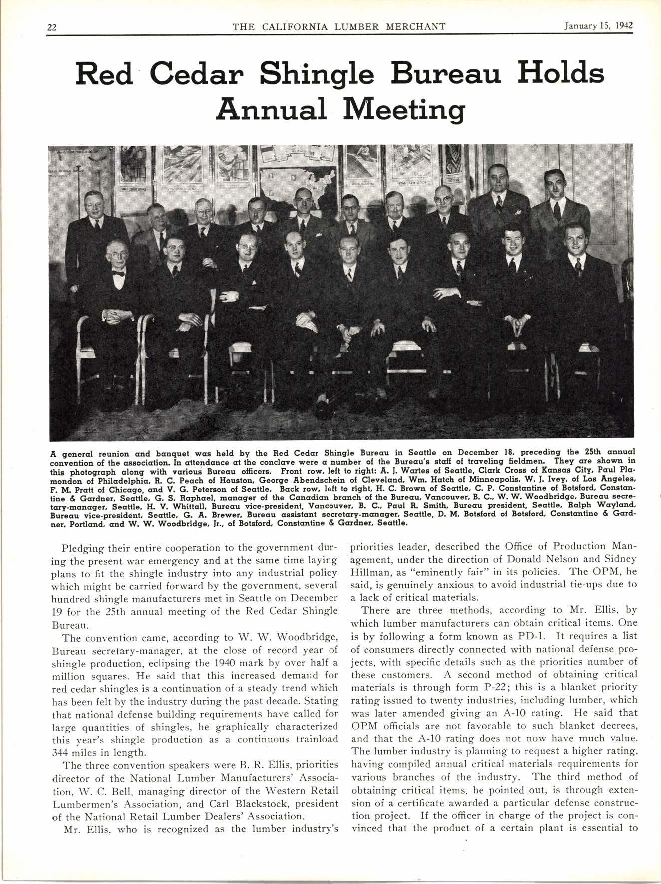A genercl reunion cnd bcnquet wcs held by the 8ed Cedar Shiagle Burecru in Setrttle on December 18, precedingr the 25th_ qnaucl con-vention of tbe cgaocicttion. ln cttendonce qi the conclave were tr number of lhe Buresu's stcll ol trcveling lieldmen" They cre shown-in ttig plotogtaph clong witb vqrioui Burequ officers. Front row, lelt to right: A. l. W_crtee_ol Seattle, Clcrk Croas 9l Kqnscs City, Pcul P-lc' -o"ali of pfitoa.tpfla, R. C. Peach ol Houeton, George Abendgchein oI Cleveltrnd, Wm. Hctch ol MinnecpoliB, W. I. Ivey- ol Loe Angeles, i. 14 pr"tt ol Chiccio, cnd V. G. Petergon of Secitle. BccL row, le'lt to right, H. C. Browa__of Seqttle, C. P. Conetcmtine oI BotElord, Conrtan' tine d Gcrdner, Sedttie, G. S. Rcphcrel, rncrncger oI the Cqncrdiqn brcrnch of the Burequ, Vcncouver, B. C., W. W' Woodbddg_e,8ure-g-u sece-i;ty-;";;d, 3ecnle, tt. V. Wtritictl, iurequ -vice-preaident, Vcncouver, B. C., Pcrut R. Snith, Buresu president, Seqttle, Rclpb Wcvltnd, Bwecru vije-president, Setrttle, G. A. Brewer, Burelu cgsistqnl secretqry-ncsnqger, Secttle, D. M. Botelord oI Botslord, Conrlcrntine d Gardner, Portlcrnd, cnd W. W. Woodbridge, Ir., ol Botglord, Congtcrntine 6 Gcrdner, Secttle.