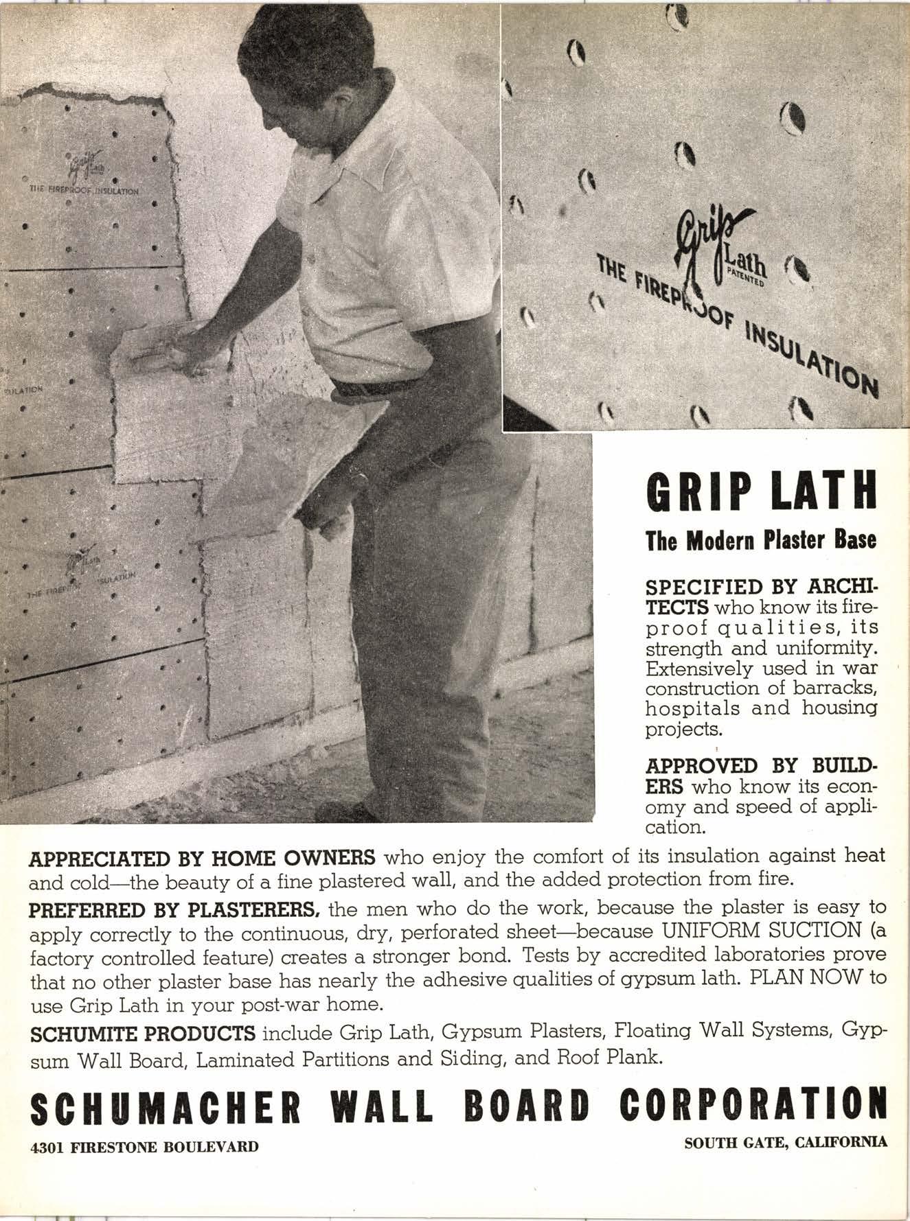 PREFERRED BY PLASTERERS, the rnen who do the work, because the plaster is easy to annlv r--omer--tlv to the continuous, dty, perforated sheet-because UNIFCRM SUCTION (a factory controlled feature) creates a stronger bond. Tests by accrediteC laboratories prove that no other plaster base has nearly the adhesive qualiiles of gypsum lath. PLAN NCW to use Grip Lath in your pcst-i,var home. f've read and heard a lot about the American soldier's idea of what he's fighting for. But I think what an American fyer told Bill Henry, the commentator, is the best answer yet. He said: "![fe had a bunch of fighter pilots from North Africa coming horne. Atl the way across they talked about what they were going to do. One of them said he was going out to the Yankee stadium and hole up there for a week. He was going to get sick eating hot dogs and drinking pop and he was going to cuss the umpire, and holler every time anyone got a hit. That was what he'd been fighting for. That's part of the America he loves now as he never loved his country befo,re. They were afl'pretty much like that." **r*