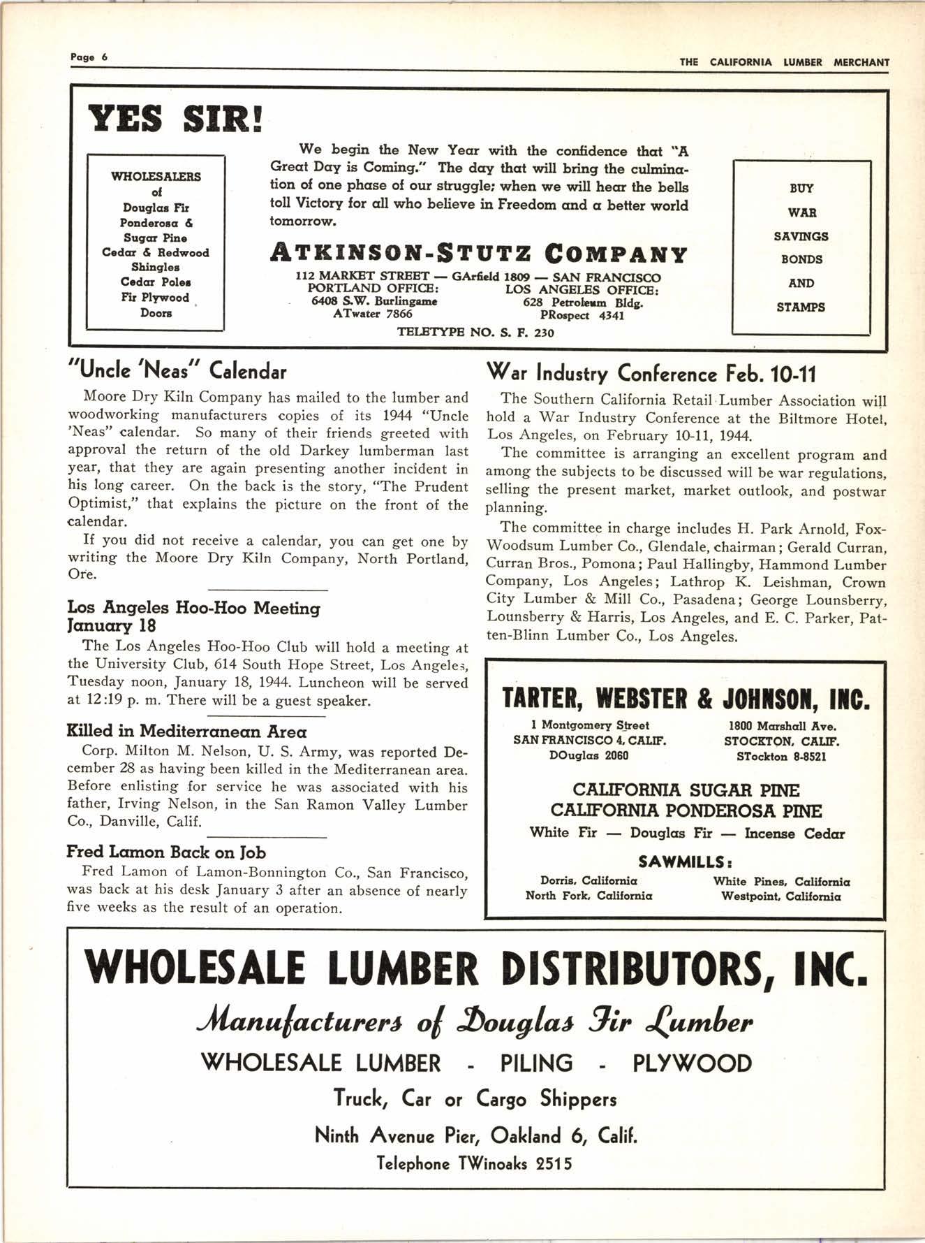 Moore Dry Kiln Company has mailed to the lumber and woodworking manufacturers copies of its 1944 "Uncle 'Neas" calendar. So many of their friends greeted with approval the return of the old Darkey lumberman last year, that they are again presenting another incident in his long career. On the back is the story, "The Prudent Optimist," that explains the picture on the front of the calendar.
