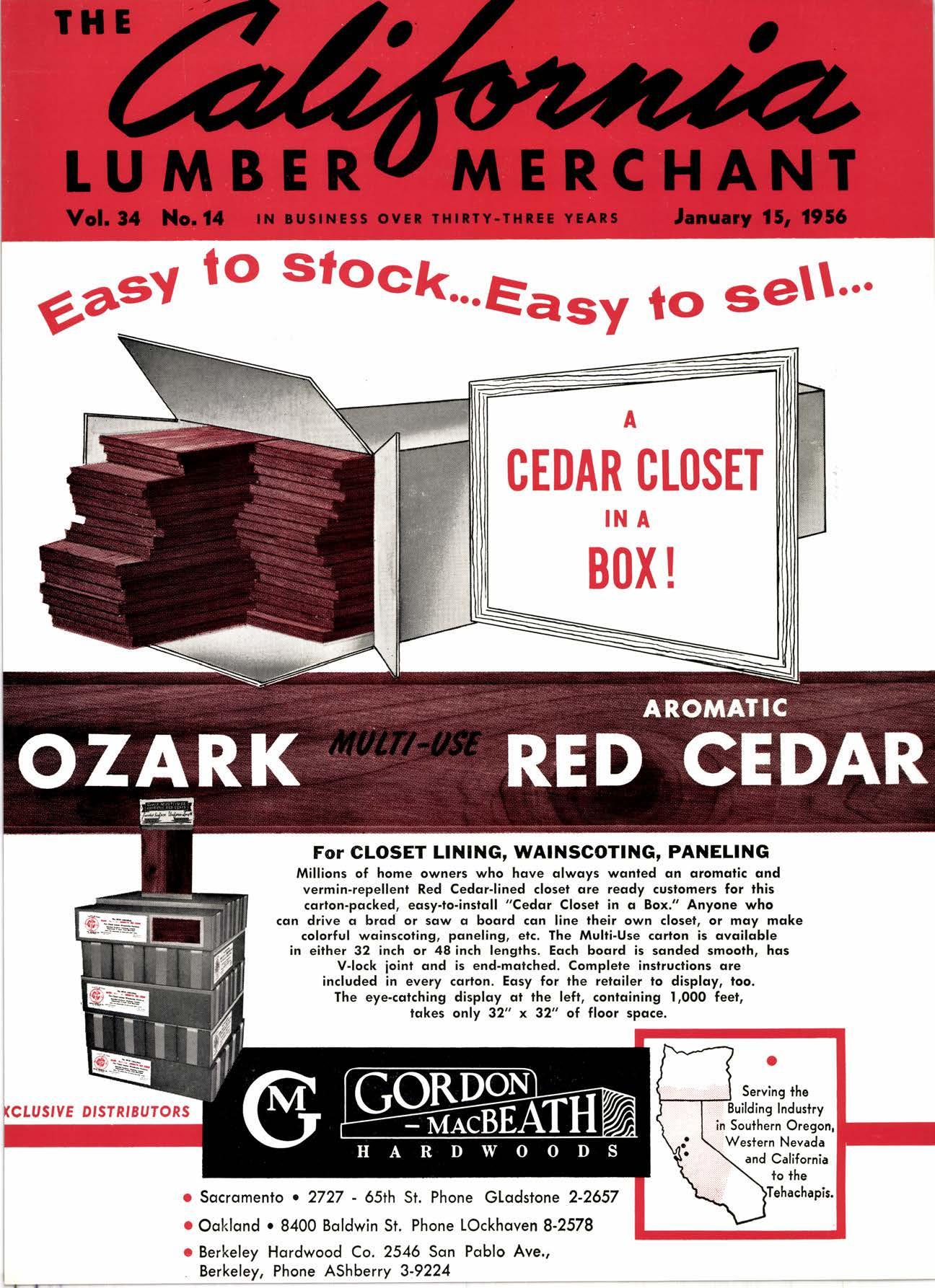 Millions of home owners who hove olwoys wonted on oromolic ond vermin-repellent Red Cedor-lined closet ore reody customers for this corton-pocked, eosy-fo-instqll "Cedor Closet in o Box." Anyone who cqn drive o brod or sow o boord con line their own closet, or moy moke colorful woinscoting, ponelinE, elc. lhe Multi-Use cqrlon is ovsiloble in either 32 inch or 48 inch lengths. Eoch boord is sonded smooth, hos V-lock joint ond is end-motched. Complete inslructions ore included in every corton. Eosy for the retoiler to disploy, too. The eye-colching disploy ot the left, contoining 1,000 feet, fokes only 32" x 32" of floor spoce.