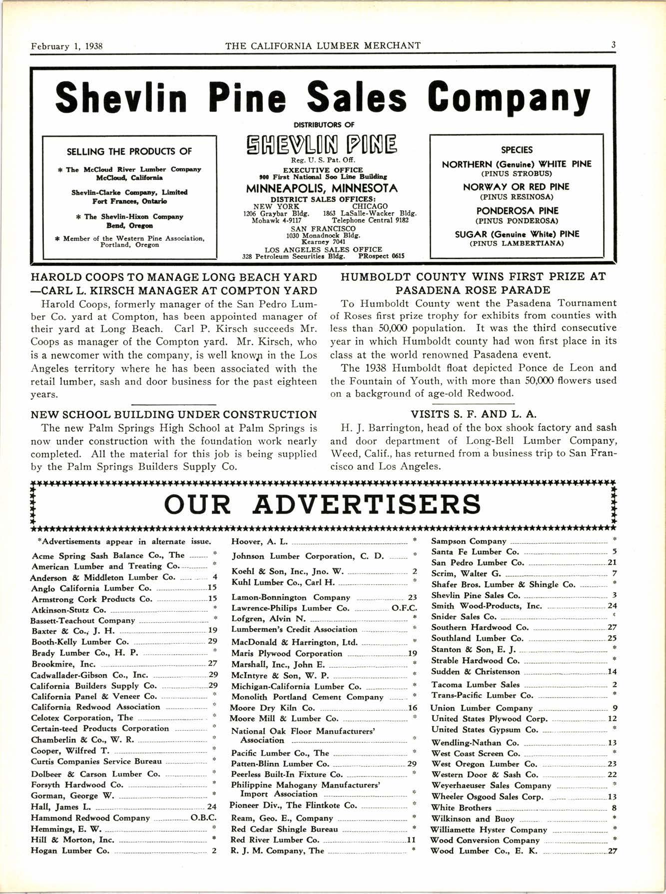 Harold Coops, formerly manager of the San Pedro Lumber Co. yard at Compton, has been appointed manager of their yard at Long Beach. Carl P. Kirsch succeeds Mr. Coops as manager of the Compton yard. Mr. Kirsch, who is a newcomer with the company, is well knowp in the Los Angeles territory where he has been associated with the retail lumber, sash and door business for the past eighteen years.