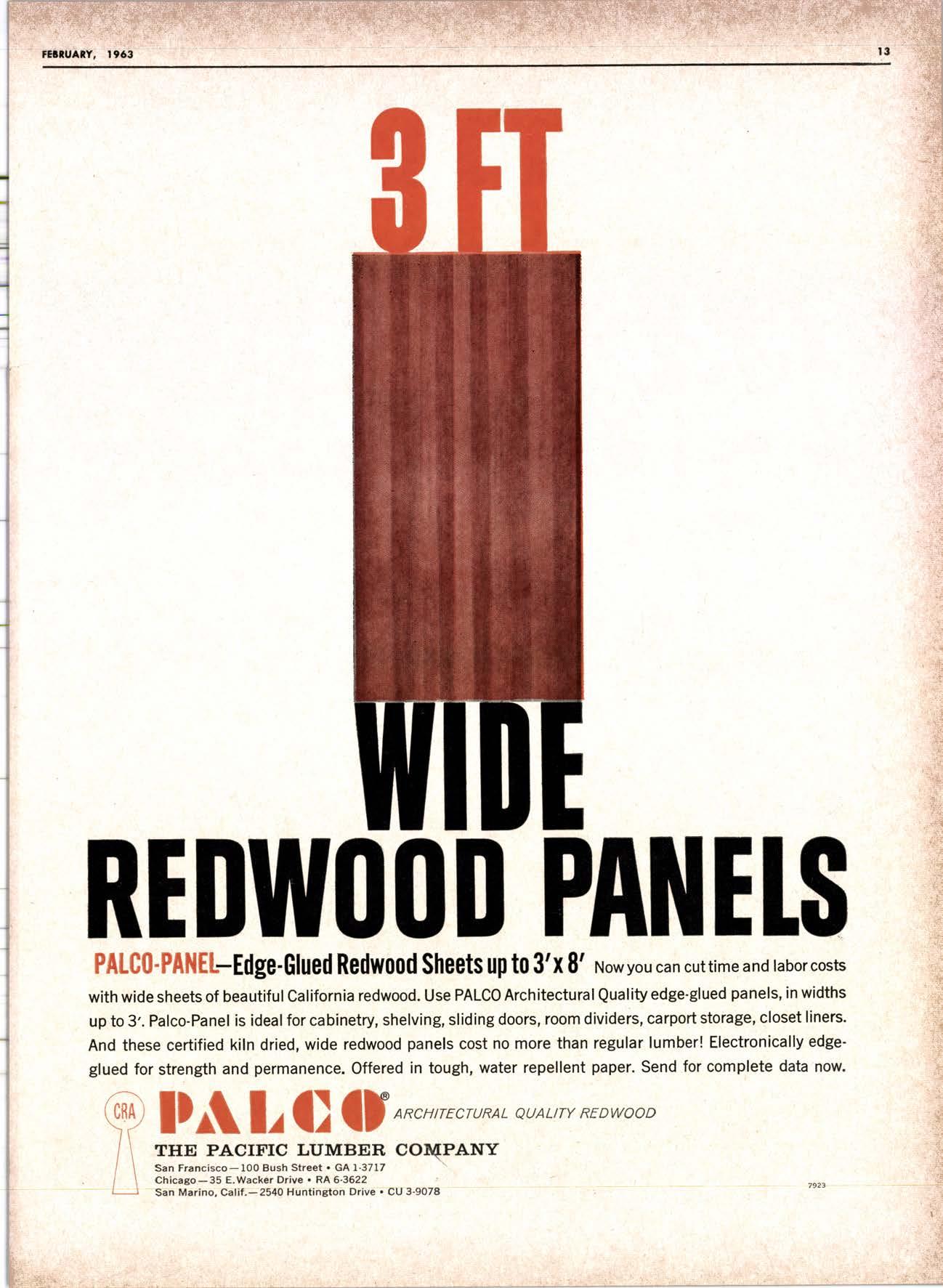 A fresh new look in wood paneling can be achieved by the use of ARCO E-GLUE. Panels tailor-made to exact length and width specifications from selected pieces of kiln dried old-growth redwood, can be quickly and economically installed in new
