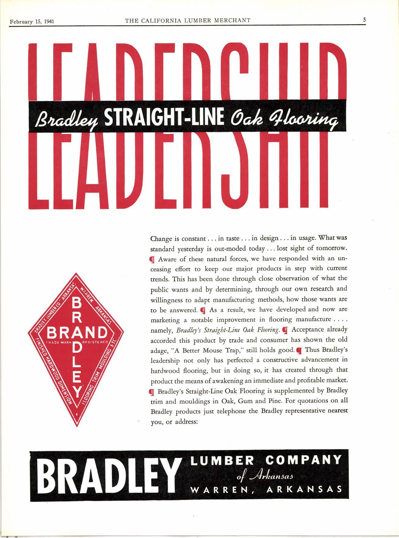 $ Aware of these natural forces, we have responded with an unceasing effort to keep our maior products in step with current trends. This has been done through close observation of what the public wants and by determining, through our own research and willingness to adapt manufacturing methods, how those wants are to be answered. { As a result, we have developed and now are marketing a notable improvement in flooring manufacture namely, Bradhy's Snaight-Line Oah Flooring.l$ Acceptance already accorded this product by trade and consumer has shown the old adage, "A Better Mouse Trap," still holds good. f Thus Bradley's leadership not only has perfected a constructive advancement in hardwood flooring, but in doing so, it has created through that product the means of awakening an immediate and profitable market.