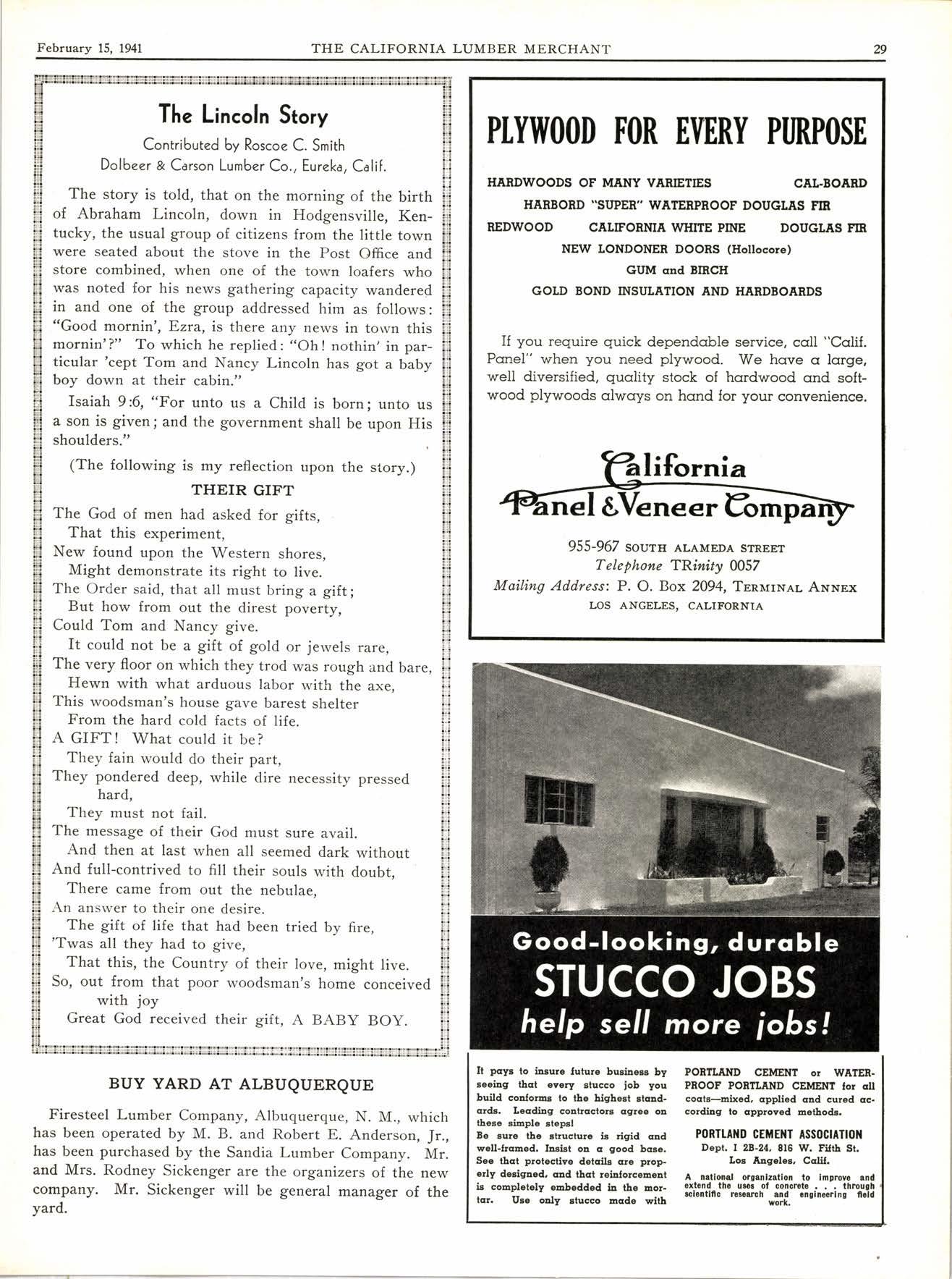 Firesteel Lumber Company, Albuquerque, N. M., which has been operated by M. B. and Robert E. Andersori, Jr., has been purchased by the Sandia Lumber Company. Mr. and Mrs. Rodney Sickenger are the organizers of the new company. Mr. Sickenger will be general manager of the yard.