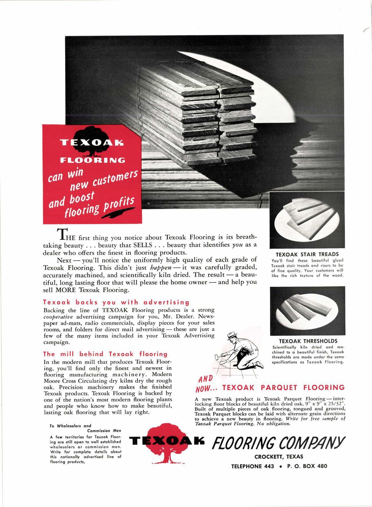 Backing the line of TEXOAK Flooring products is a strong cooperatioe advertising campaign for you, Mr. Dealer. Newspaper ad-mats, radio commercials, display pieces for your sales rooms, and folders for direct mail advertisingthese are iust a few of the many items included in your Texoak Advertising campaign.
