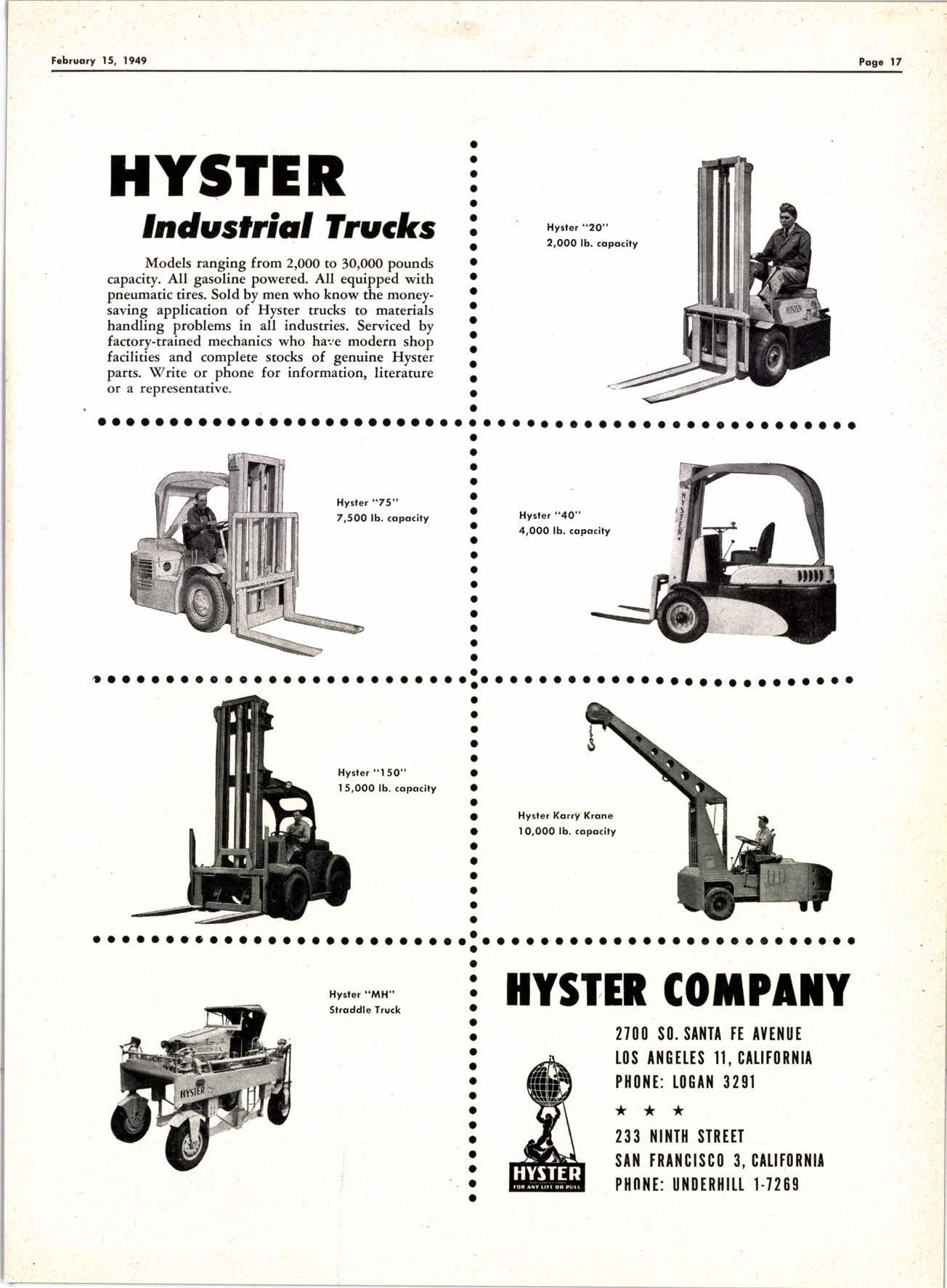 Dependable all-surface, all,weather performance insures continuous year-around operation. Models to handle and high-pile loads in a range from 5,000 to 18,000 pounds. Big, safety-cushion hydraulic hoist and tilt mechanisms. Positive, easy.drive hydraulic steering and many other points of superiority make these the lift trucks you'll want working for you.