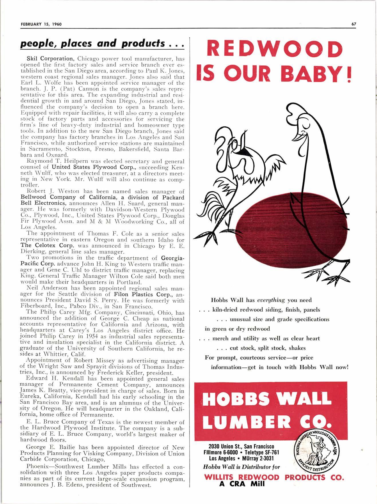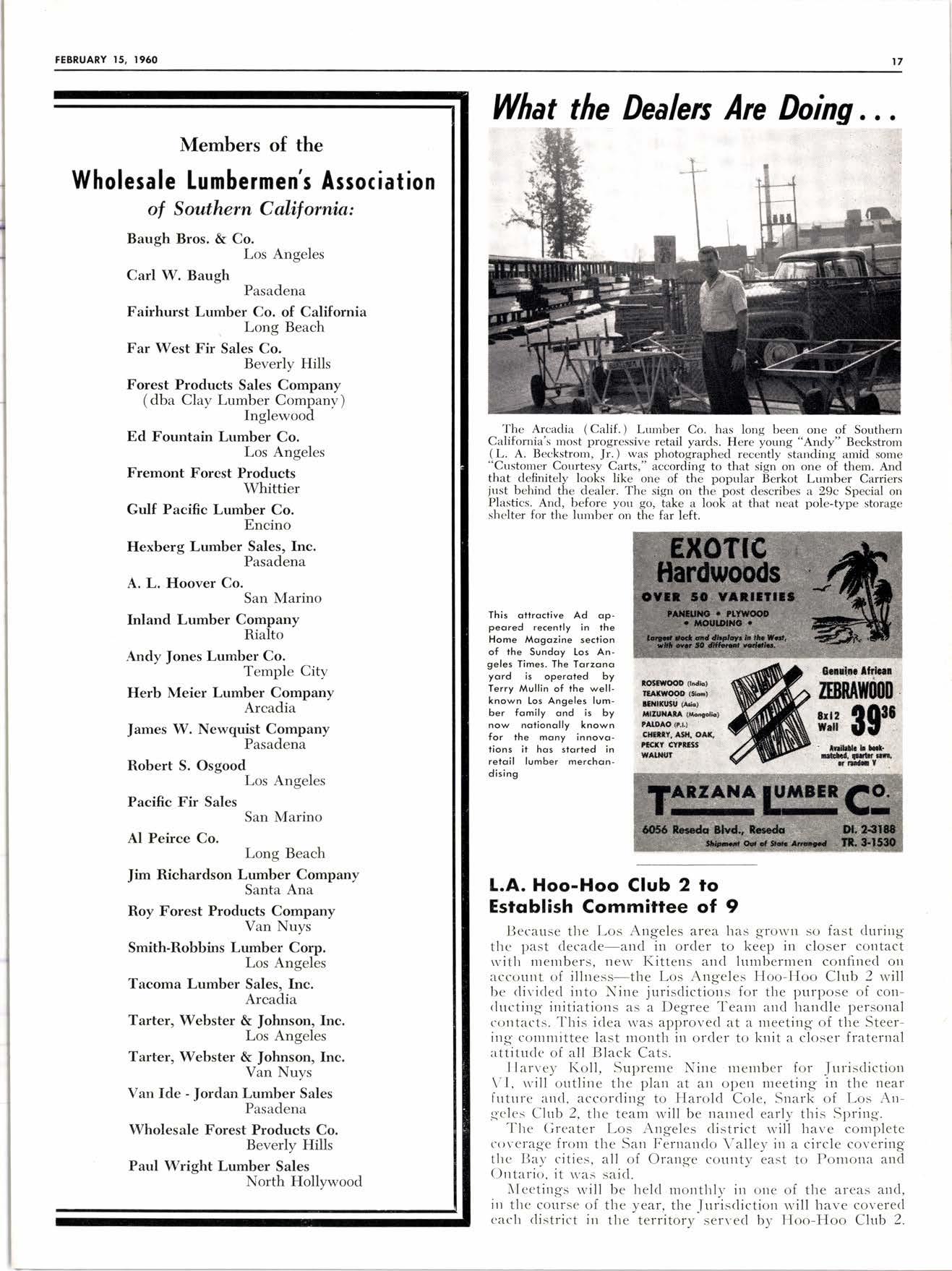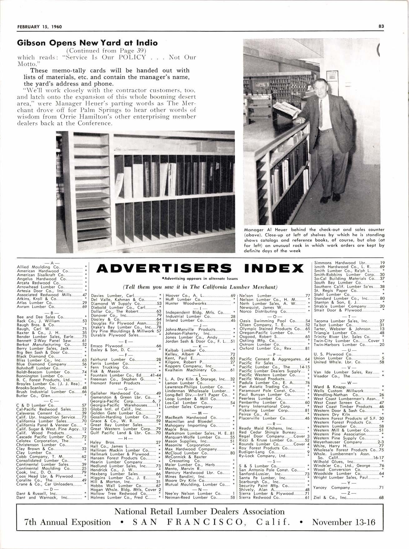 T2 IB t7 20 50 Personals....-.... 25 \'ears Ago.........-.-....Obittrary......-.. Want Ads-.-... ADVERTISERS' INDEX. 55 56 60 82 83 "A Boy Is the Only Thins God Can Use to N{ake a Man"-....-.-...-........ 4 Diamond National Opens Re'modeled Santa Rosa Yard,,.... 8 Tom Fox Named General Chainnan of 1960 Dealer Exposition.-...--... l0 San Francisco Hoo-Hoo Hear of Ciants, 49ers at Sports Nite-..-...-....-... 22 Forest Products Society Annual Discrrsses Dealer Problems.........--..-., 24 A New Approacl-r to Advertising Framing Lumber.-.---...---......,..,--.......- 30 Riverside Hoo-Hoo Change Name to Inland Empire Club No. 1I7...... 32 Gibson Lumber Co. Opens One-Stop Store in 6dio-..........._...._--_._.-..... 36 N-AWLA Kicks Off Sales-Training Program at S. F. N{eeting.,............ 40 Pole-type Buildings "Hottest" Itern in Construction pield.--.-..-.......... aS "To Be Home Builders"-An Editorial,..--.--.,....--,-.- ........- E2 Flu Epidemic Thins the Ranks at L. A. Hoo-Hoo Club 2 Dance..,......- 78 National Retail Lumber Dealers Association TthAnnualExposition . SAN FRANCISCO, Calif. . November18-16 --1-Y -[5OIrrI-I'ilIB-R, (E'DtrIPAIUY 8u*6", at its Sest from tl,t Wot J" JL;, *Loonn Vasabond Editori:rls,.,.-..-. N"i' p.od,r"tt-...--.,-...,..--..-... i;, Dealer Doings-,-,.,--.....--. My Favorite Story....-.,.,, Fun-Facts-Filosophy TELEPHONE SP 3.7368 TVX AtF-t25 POST OFFICE BOX 849/vtEDFORD, OREGON SOUTHERN CATIFORNIA SAIES: P. O. Box 731 Arcodio, Colifornio Ilerb frleier lumhcr lllUnay l-8181