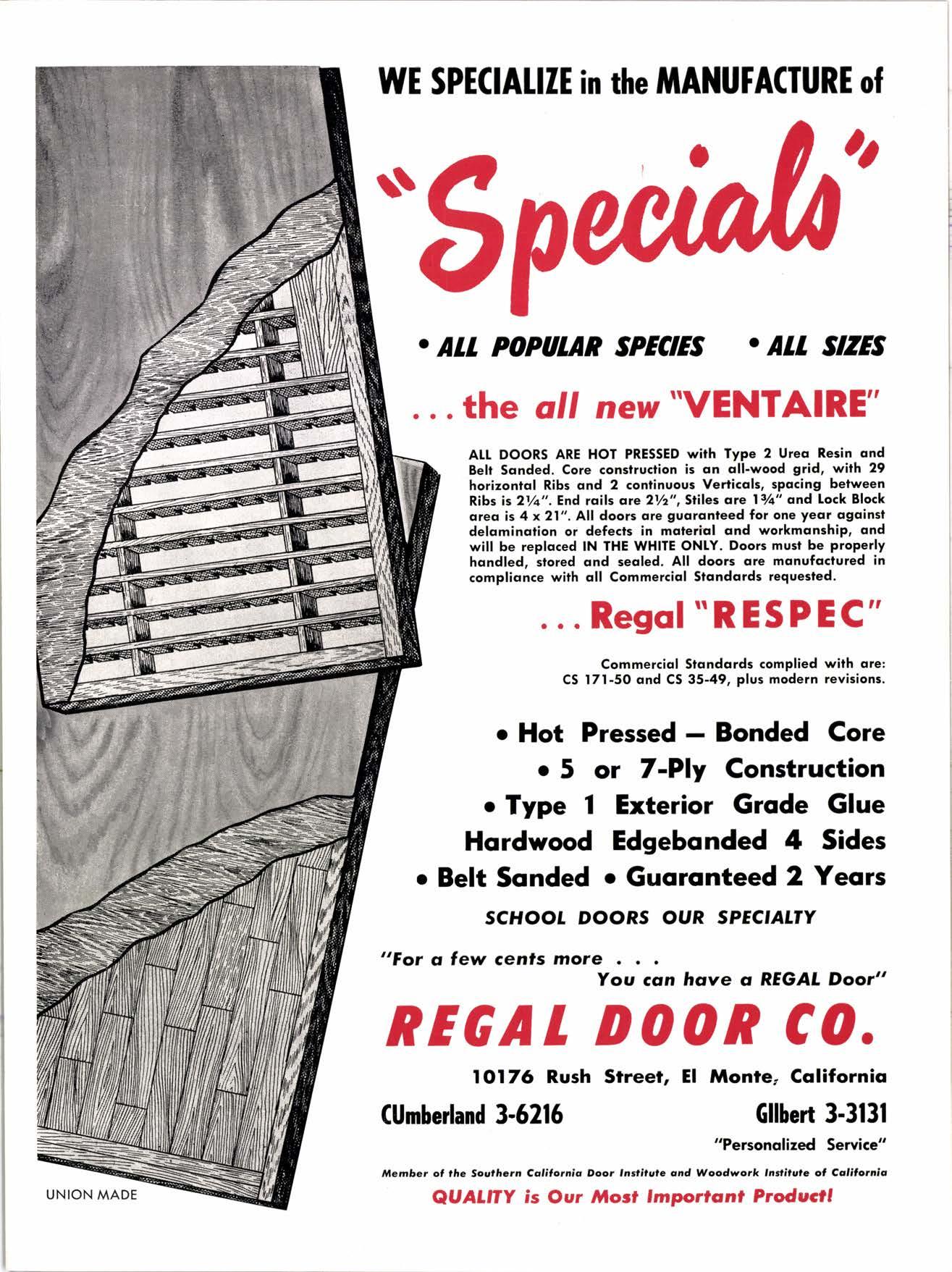 o Hot Pressed - Bonded Core o 5 or 7-Ply Construction o Type I Exterior Grode Glue Hqrdwood Edgebqnded 4 Sides o Belt Sonded o Guoronteed 2 Yeors SCHOOI, DOORS OUR SPEC',ALTY ttFor q few cenfs more . . You cqn have o REGAI, Door" REGAT I'OON CO, 10176 Rush Street, El Monle, Colifornio CUmberland 3-6216 Gllbert 3-3131 "Personolized Service" Member ol tlre Soutfrcrn Calilomio Door fnrlflulc and Woodwork ,ns|itotc oJ Calilornla QUAITIY is Our Most lmporlon] Productl UNION MADE