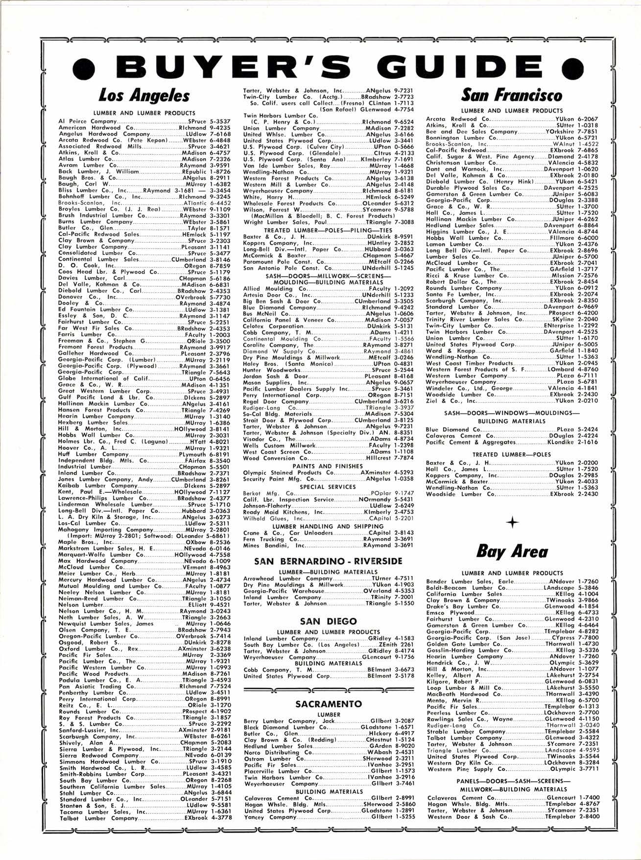 Froncisco IUMIER AND IUMBER PRODUCIS A.(old Redwood Co.-........-.......-............-.....YUkon 6-2067 Atkins, Kroll & Co.......-..........--...-...............SUtter l-0318 Bee ond Dee Soles Compony-----...----.-..YOrkrhire 7-7851 Bonninglon Lumber Co..-...---.-....-.------------.---YUkd 6-5721 Brooks-Sconlon, Inc...-.--....--.-.-...-----..------.---WAlnut l -4522 Col-Pqciftc Redwood..--......------..-..---...-.--.----EXbrook 7-6865 Cofif. Sugor & Wett, Pine Agency--------Dlmond 24178 Ch.iilenron Lmber Co,-..-..-...-.....--...--.....VAlenciq +5832 Dot ond Wmock, Inc..-...-..-.--.-..-.....DAvenport l-0620 Del Volle, Kqhmqn & Co.--.----.....-.....,,,-..EXbrok 2-0I80 Diebold Lmber Co. (Henry Hink)........-...YUkd 6-5421 Higgin5 Lmber Co., J. E.------.-------..-..---VAlenciq 4-8244 Hobbs Woll Lmber Co.-----,------..-----.------Flllmore 6-6OO0 Lmon Lmber Co.-.----..------------------...--.--------YUkon 2-4376 Log Bell Div.-lntl. Poper Co.-.----------EXbroo& 2-8696 Lmber 5oles Co.-------.---------,----------.--.----.--"JUniper 5-57q) McCloud Lumber Co.--.,-,-,-----,--,..---.--.------EXbrook 2-7O41 Pqciftc Lmber Co., The-,,-------------.--.....----GArfield l-37I7 Ricci & K.u!e lumber Co.---.-.--,- --------------|i||stion 7-2576 Robe.t Dollor Co., lhe..-..........--..--.--........EXbrook 2-8454 Roundr Lumber Comp@y,------.--.--.-----.--..------YUkon 6-0912 Sdtq Fe Lmber, Inc.-------.-.----..-.,--,--------EXbro*. 2-2071 Scorburgh Compony, ln<..-........-..---..-.......EXbrook 2-835O St6dqrd Lmber Co,..-.----,-.-.----.---.,-.---DAvenporl 6-9&9 Tqner, Webrler & Johnron, 1nG.....--.-.---PRospdt 6-4200 Trinity niver Lmber Sqles Co.-.----.---...-..5Kyline 2-2O4O Twin-City Lumber Co..............-..............ENterprite 1-2292 Twin HorboB Lumber Co..--.--..----..-.....DAvenport 4-2525 Union Lwber Co.-----.-...-.....--.--.-.-.-.-.---..-....5Utter l-6170 United Stqtet Plywood Corp...,-........---..-..JUniper 6-5005 Word & Knopp.. ......----GArfield I -I8rO Wendling-Ncthm Co.--..........-.--.,--.,--............5Utter l -5363 Wert C6rt limber Products........................YUkon 2-0945 Werlern Forerl Prodectr of 5, F,............lOmbod 4-87@ Wesfern Lmber Compmy.....-......----.....-.-....Plorq 6-71 ll Weyerhoeurer Compony...-.-......-...................--Plqzq 5-6781 Windeler Co., Ud., Geo.ge-...-...............V41enciq 4-1841 Woodride Lmber Co...-..-.-.-..-.-..---....--....CXbrok 2-2430 Ziel & Co., Inc...-.-----.--.....-.-.-.....--.-------.--....YUkon 2-O2lO SaSH-DOORS-WI NDOWS--I OUrDINGsBUITDING 'I,IAIENIATS Efue Dimond Co.......-...-----...-.--..--------..-.......PLola 5-2424 Cof wgro Csment Co.----..--.........---.-..,-....DOug1 as 2-4224 PociflG Cement & Aggregotei..-...............KLondike 2-1616 TREATED IUfrtEER-POIES Boxter & Co., J. H....-.-...-..........................YUkon 2-OIOO Hoff Co., Jmer 1...-......--.----.---.-----.---------..sutler l-752O Koppers Cmpony, In<.---.-,-,-,-.,---,-,-..,.-...DOug16 2-2985 lrtccomick & Boxter,-..,.,..-.-,.,..,..-.-----.--......,-YUkm 2;O33 Wendling-Nothon Co..--......-...--..--.-....,..-.....-.sutle. I -5363 Woodside Lcmber Co.---.----.-.-----------..--....EXbrook 2-243()