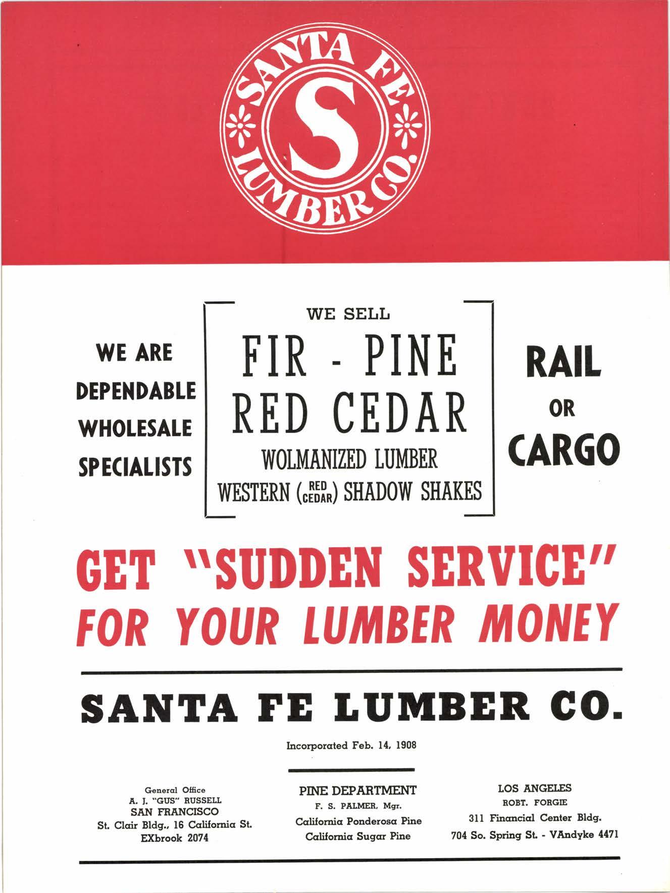 WE ARE DEPENDABLE WHOLESALE SPECIALISTS RAIL OR CARGO WE SELL FIR . PINE RED CEDAR VIOLMANIZED LUMBER WESTERN (,151il SHADOW SHAKES SANTA FE IUMBER CO. Generol Ollice A. J. "GUS" RUSSELL SAN FRANCISCO St. Clcrir Bldg., 16 Cclilornicr St. EXbrook 2074 Incorporcrted Feb. 14, 1908 PINE DEPARTMENT F. S. PALMER. Msr. Ccrlilornicr Ponderoscr Pine Ccrlilornicr Sugcrr Pine tOS ANGEI^ES ROBT. FORGIE 3ll Fincrncicrl Center Bldg. 704 So. Spring St. - VAndyke 4471