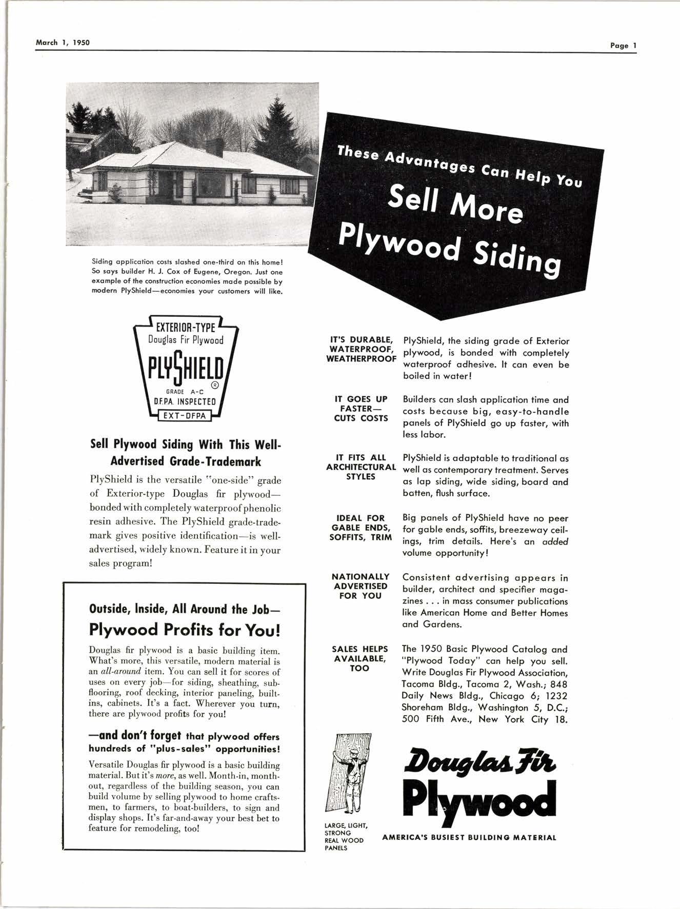 The 1950 Bosic Plywood Cotolog ond "Plywood Todoy" con help you sell. Write Douglos Fir Plywood Associotion, Tocomo Bldg., Tocomo 2, Wosh.; 848 Doify News Bldg., Chicogo 6; 1232 Shorehom Bldg., Woshington 5, D.C.; 500 Fifrh Ave., New York City 18.
