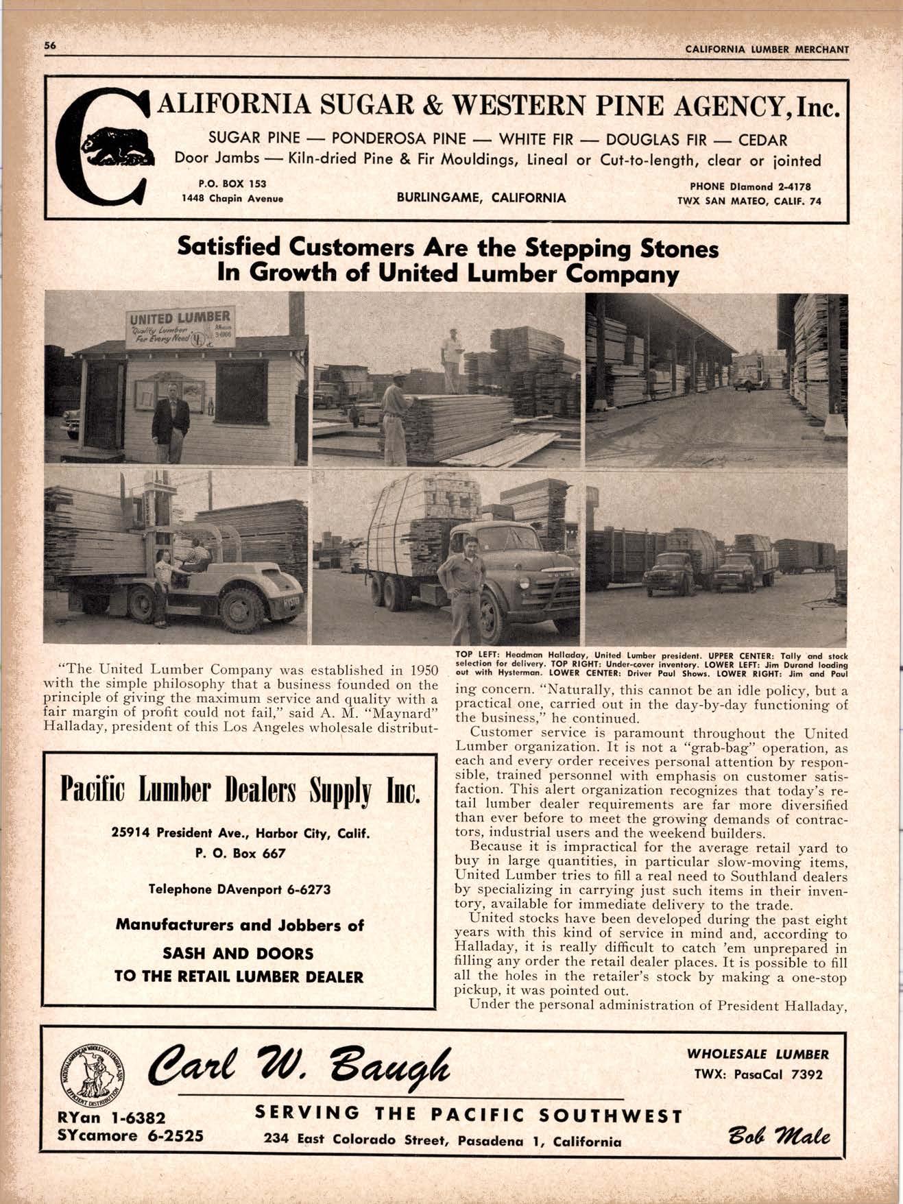 BUILDING MATENIALS Amariccn Sisclkrclt Corporction .WEbster I-1051 Artesic Door Co. Inc. ...llNderhitl 5-1233 Cclilornic PcnEl d Veneer Co. ......TRinity 0057 Ccrlow Compcny ...... .Plecsant 2-3136 Ceco Steel Corp. ......ANaelus 8-67!! Cobb Compcnv, T. M. .. ..ADcms l-lll7 Coralite C6mpLny, The ............ADcms 2-8101 Fidler's Mlq, Co., Inc, ...OBegon 8-8991 Forest Fibei Producls Co. .MAdisoa 6-1758 Hclev Bros. (Scntc Monicc) ........TExcs 0-4831 Jobns-Mcnville Scles Corp. ........Mlchigcn 60ll Koehl 6 Sou. lohn W, .ANgelus 9-8191 Magon Suoplieg, Inc. ..ANselus 9-0657 Mqsonite Corporclion ...ANgelus 3-6191 Mcvlcir Scles ol Cclil. ..Vlctoric 9-3294 Pccilic Lumber Declers Supply Co. ...ZEnith l156 Reqal Door Compqnv .-. .-. CUnberlcnd 3-8216 So--Ccl Blds. Mcteridls .. .TRinity 5304 Strcit Door Mlg. Co. .CUmberlcnd 3-5'188 Sweatem, Portlcnd Ceneat Co. ..MAdison 6-6711 West Cocst Scrcea Co. ...ADane l-1I08 Wood Conversion Co. ... .Elliott 8-2896 Lonc-Bell Div.-Intl. Pqper Co....EXbrook 2-8696 Lumber Scles Co. ....JUniper 6-5700 McCloud Lumber Co. ...EXbrook 2-7041 Pccilic Lumber Co., Tbe .GArlield l-3717 Ricci d Kruse Lumber Co, ........Mlssioa 7-2576 Rounds Lumber Compquy .YUkon 6-0912 Roddiecrclt Lumber Scles ......DAvenport 2-2154 Sqntc Fe Lumber, lac. ...........EXbrook 2-2074 Simpson Redwood Compqnv .......YUkon 6-6724 Stc;dcrd Lumber Co. .....DAvenport 6-9669 Tcrter, WebEler 6 tohnson, Inc. ..PRos-pect 6-4200 Twin-Citv Lumber Co. .ENterprise l-2292 Twin Hcrbors Lumber Co. .....DAvenport 4-2525 Union Lunber Co, .....SUtter l-6170 United Stcies Plvwood Corp, .ATwqter 2-1993 Wendlins-Ncthcri Co. ....SUtter l-5363 West Cocst Timber Produqts AEency YUkon 2-0945 Western Lunber Co. ...LOmbcrd 6-3305 Weyerhceuser Scles Co. ...Plczc 5-6781 White Brothers .ATwcter 8-1430 Windeler Co., Ltd., George ..VAlencic 4-1841 TBEATED LUMBER_POLES Bcxter, l. H. G Co. .......YUkon 2-0200 Hqll Co., fcmes L. ........SUtter l-7520 Wendliug-Ncthcn Co, . .SUtter l-5383 MATENIALS HANDI,ING Hysler Conpcny ...Mssion 8-0680 SPECIAL SERVICES Gcrehime Corporalion .SUtter l--8!!! Gilbreath Chemiccl Co.. SUtter I-7537