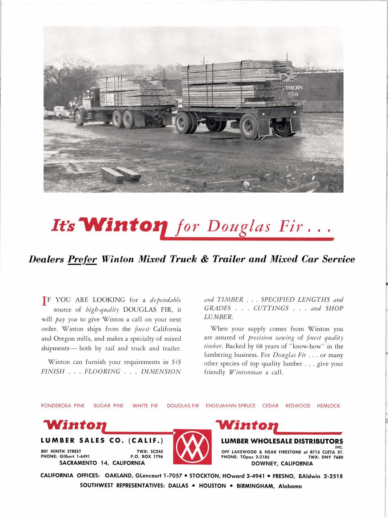 fF YOU ARE LOOKING fora dependable source of. high-quality DOUGLAS FIR, it wrll pay you to give \Winton a call on your next order. S7inton ships from the f.nest California and Oregon mills, and makes a specialty of mixed shipmentsboth by rail and truck and trailer.