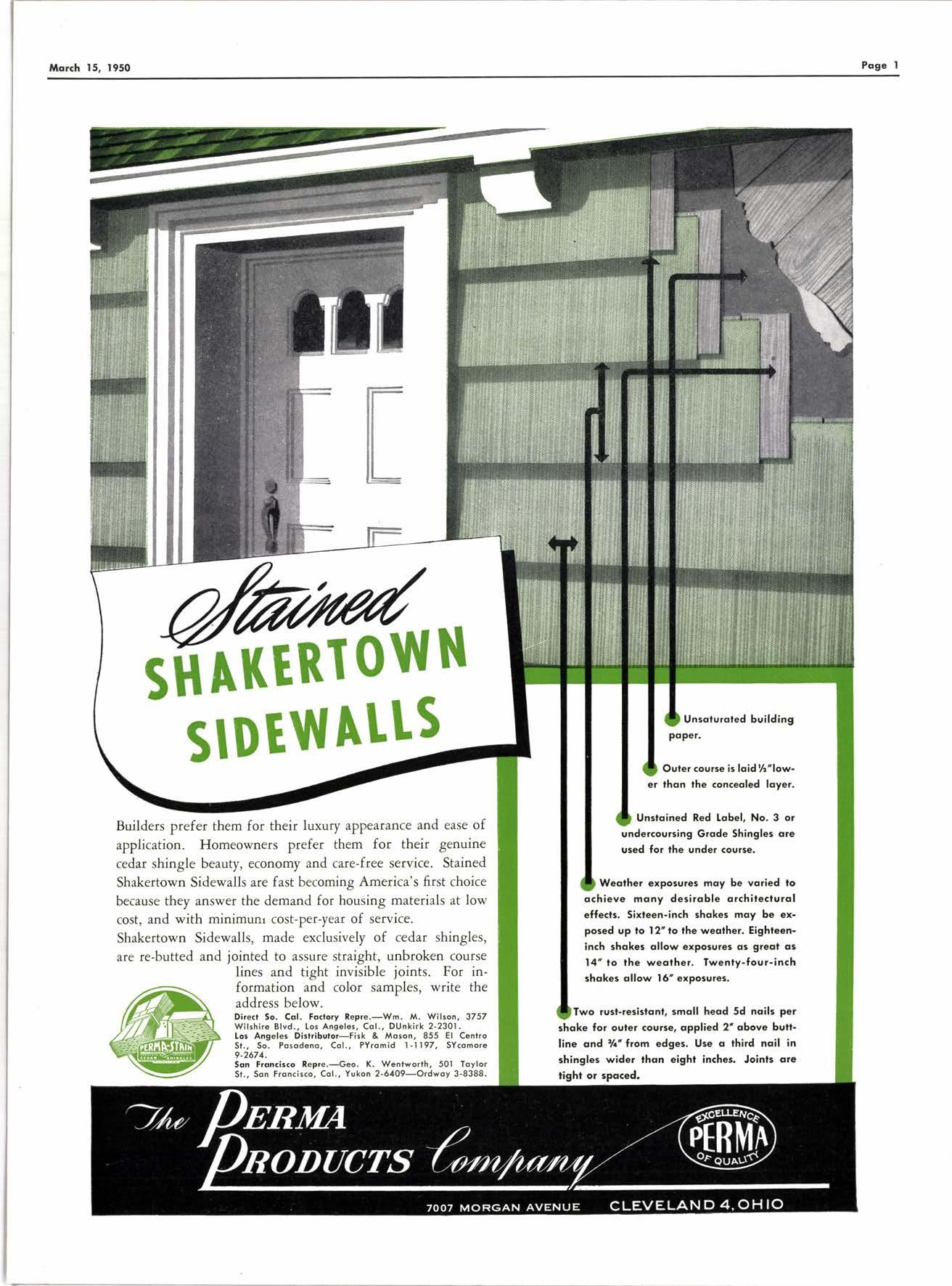 Builders prefer them for their luxury appearance and ease of application. Homeowners prefer them for their genuine cedar shingle beauty, economy and care-free service. Stained Shakertown Sidewalls are fast becoming America's first choice because they answer the demand for housing materials at low cost, and with minimunl cost-per-year of service.