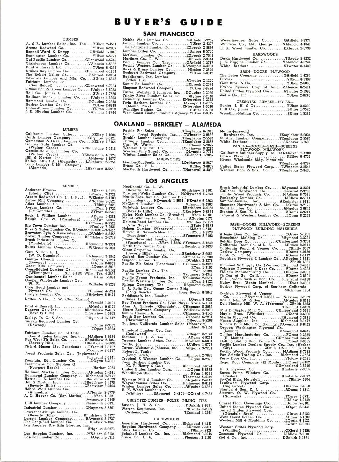 .....ORegoa 8-21{l .ADcms 4-9211 ....MAdison 6-6831 ....LUdlow l-078 .ANgelus 9-7231 HEmlock 2-7623 ..LOscn 8-2375 3-{80I-OXIord 4-7483 CNESOTED LUMBER_POLES_PILINGI_TIES Bcxter, J, H. d co.. ....DUnkirk 8-9s91 Wcnen Southw€st, I!c.............NEvada 8-2983 (Wilnington) TEmiacl 4-2551 Weyerhceuser Sqles Co..........GArfield l-897{ Windeler Co., Ltd., George......VAlenciq 4-18{l E. K. Wood Lumber Co...........EKbrook 2-0736 HARDWOODS Dovis Hcrdwood Co. ..,. .TUxedo 5-6232 I, E. Higgins Lumber Co..........VAlencia 4-87{{ White Brothers ........ATwcter 8-1430 SASH_DOORS_PLYWOOD Tbe Beton Compmy ....GArlield l-{294 Fir-Tex .YUkon 6-5392 Getz Bros. d Co. ........YUkon 2-6060 Harbor Plywood Corp. oI Cclil...VAlencic 6-2tlll United Ststes Plywood Corp.......ATwcter 2-1993 Ziel d Co,, Iuc. ..YUkon 2-0210 CRESOTED LUMBEN_POLES_ Bcxter, I, H, d Co.. .......YUkon 2-0200 Hcll Co., lmes I". .........SUtter l-7520 Wendting-Ncthcn Co. .SUtter l-5363 PANELS_DOONS_SASH_SCREENS PLYWOOD_MILLWONK Cclilornic Builders Supplv Co...LOckhcven 2-4700 Ensco Plywood .....-.:.:. .KEltog 6-4733 Hogcn Wholesale Bldg. Mcterials unired srcres ptywood c"r". ..Trt#o,,1::[: t3311 Western Door d-Scsh Co.......TEmplebcr 2-8400 SASH_DOORS MIf,LWONK-SCNEENS PLYWOOD-BUILDING MATEnIAIS Coatinentql Lumber Sqles BYca l-5681 .Horbor 202{ Cooper Wholescle Lumber Co., W. E. . ..WEbster 6-8239 Coos Hecd Lunber od Plywood Co. .TErminct 4-5261 Curly's Lunber Co. .PArkviEw 8-9{?4 Dclion 4 Co., R. W. (Sco Mcriro)PYrcmid l-212? Dcat d Ruasell, Inc. .ANgelus 9-01?4 Donover Co., Iqc. .....BRcdihcw 2-4i67 (Beverly Hills) .....CRsstviEw 4-5103 Essley, D. C. d Son ...RAymond 3-1147 Eurekc Redwood Lumber Co. (Dowaey) ....LOscn 8-3339 TOpcz 9-0993