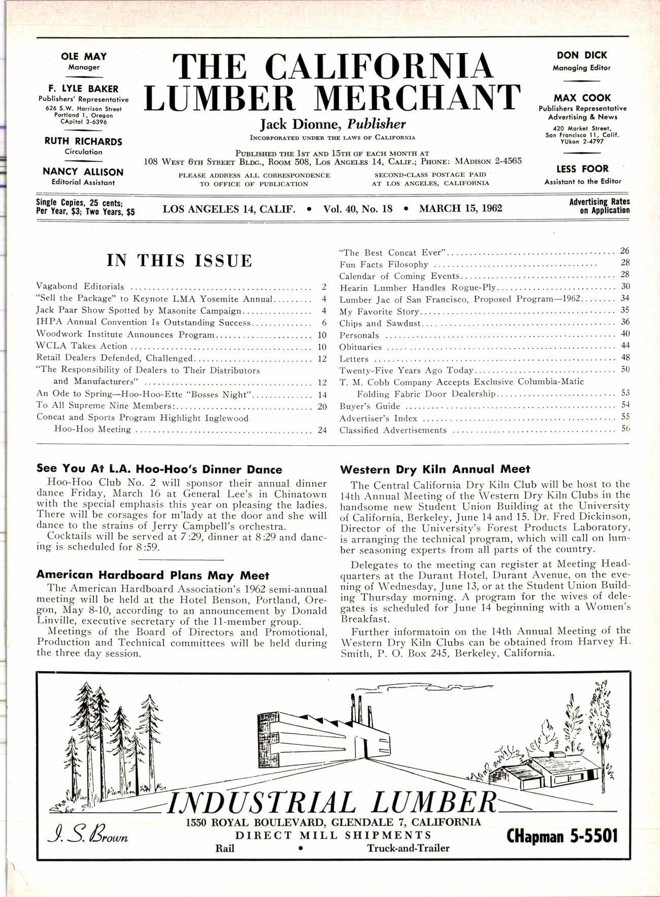 LT]MBER MERCHAI\T |ack Dionne, Publislwr INcopoRlmD uNDtR THE LAws or Cer.rronrrr PusLrsHED TrrE lsr AND tr5Trr oF EAcH MoNTrr AT 108 Wssr 6rrr Srnnpr Br-oc., Roor,r 508, Los ANcrr-ss 14, Cer-rr.; PnoNn: MAorsoN 2-4565 PLEASE ADDRESS ALL CORRESPONDENCE TO OFFICE OF PUBLICATION SECOND-CI..1\SS POSTAGE PAID AT LOS ANGELES, CALIFORNIA DON DICK Alonoging Editor MAX COOK Publishcrr Reprcrenlotivc Advertiring & Ncws a20 Alork.f Strat, Son Froncirco ll, Collf. YUkon 2-1797 LESS FOOR Assirlonl to the Ediror !ing!9 Copi?s,_25 cents; PciYcrr,'|3;'Iwo Vears, $5 LOS ANGELES 14, CALIF. o Vol.4O, No. 18 MARCH 15' 1962 AdYrrtising [rtcs on lpDlicetlon rEl lgar, )it; lf,O IEaIS, It uDe L7, vrrg|r - v vr. -vt ur aPP.rErrurl NANCY AI.I.ISON Editoriol Assistont
