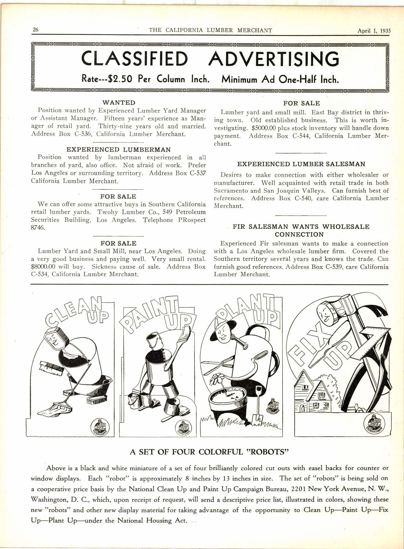 Above is a black and white miniature of a set of four brilliantly colored cut outs with easel backs for counter or window displays. Each "robot" is approximately 8 inches by 13 inches in size. The set of "robots" is being sold on a cooperative price basis by the National Clean Up and Paint Up Campaign Bureau, 2201 New York Avenue, N. \$7., Washington, D. C., which, upon receipt of request, will send a descriptive price list, illustrated in colors, showing these new "robots" and other new display material for taking advantage of the opportunity to Clean Up-Paint Up-Fix Up-Plant lJp-under the National Housing Act. - -
