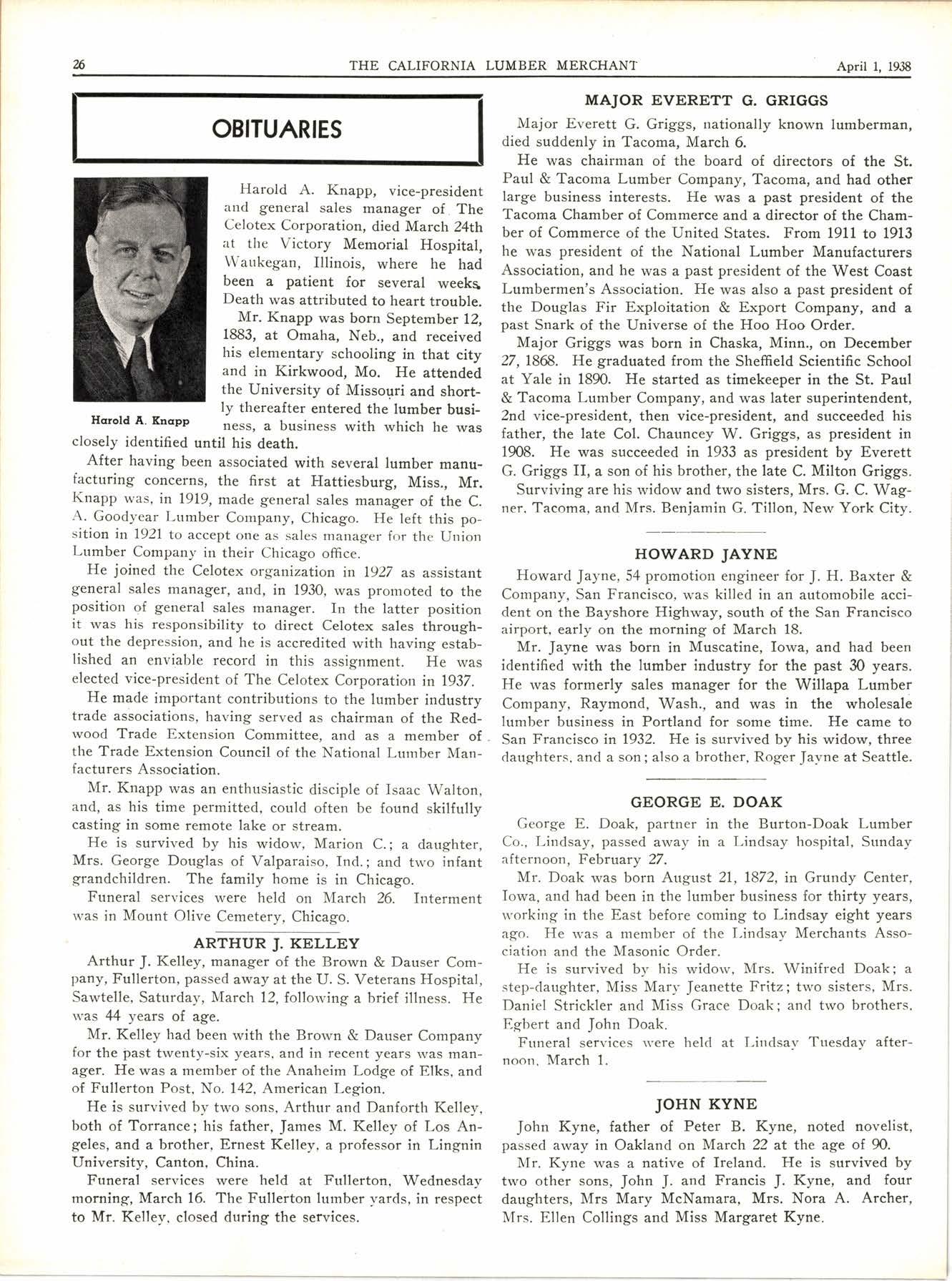 Mr. Jayne was born in Muscatine, fowa, and had been identified with the lumber industry for the past 30 years. He was formerly sales manager for the Willapa Lumber Company, Raymond, Wash., and was in the wholesale lumber business in Portland for some time. Ife came to San Francisco in 1932. He is survived by his widow, three daughters, and a son; also a brother, Roger Javne at Seattle.