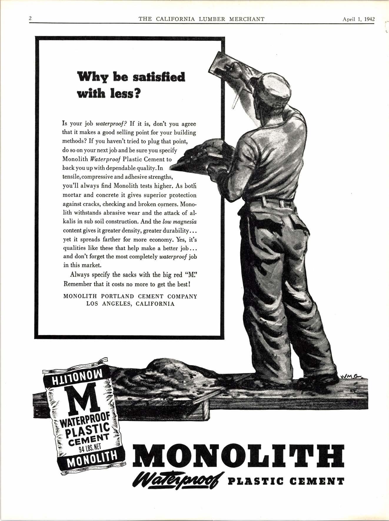 Is your job wanrprooJP If it is, don't you agree that it makes a good selling point for your building methods? If you haven't tried to plug that point, do so on your next job and be sure you specify Monolith Vaterproof Plastic Cement to back you up with dependable quality.In tensile, compressive and adhesive strengths, you'll always find Monolith tests higher. As botli mortar and concrete it gives superior pqotection against cracks, checking and broken oorners. Mono. lith withstands abrasive wear and the attack of al. kalis in sub soil construction. And the lout magrcsia content gives it greater density, greater durability... yet it spreads farther for more economy. Yes, it's qualities like these that help make a better job... and don't forget the most completely untcrprooJ job in this market.