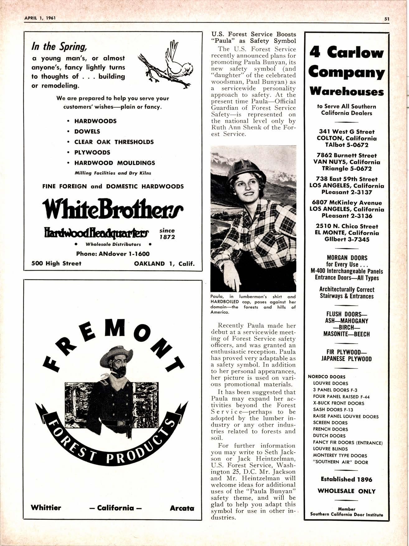 Despite what you may have heard, we don't have 50,000 trained woodpeckers to create Lam-Loc Pecky Cedar. A natural tree fungus makes the pecks and stops the minute the tree is cut. We do have several other mystical things we do to it, however. It's all explained in our mystical manual. Write for one. Ed Fountain Lumber Company, 6218 South Hooper Ave., Los Angeles, Calif.
