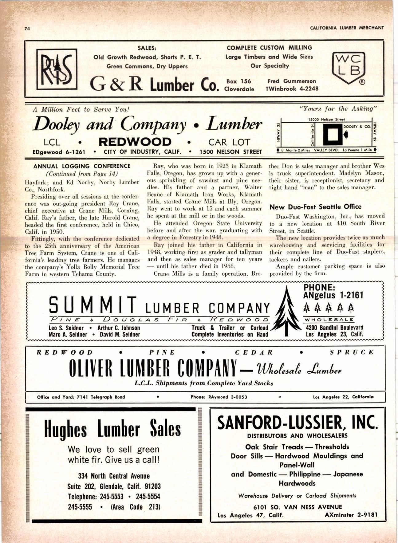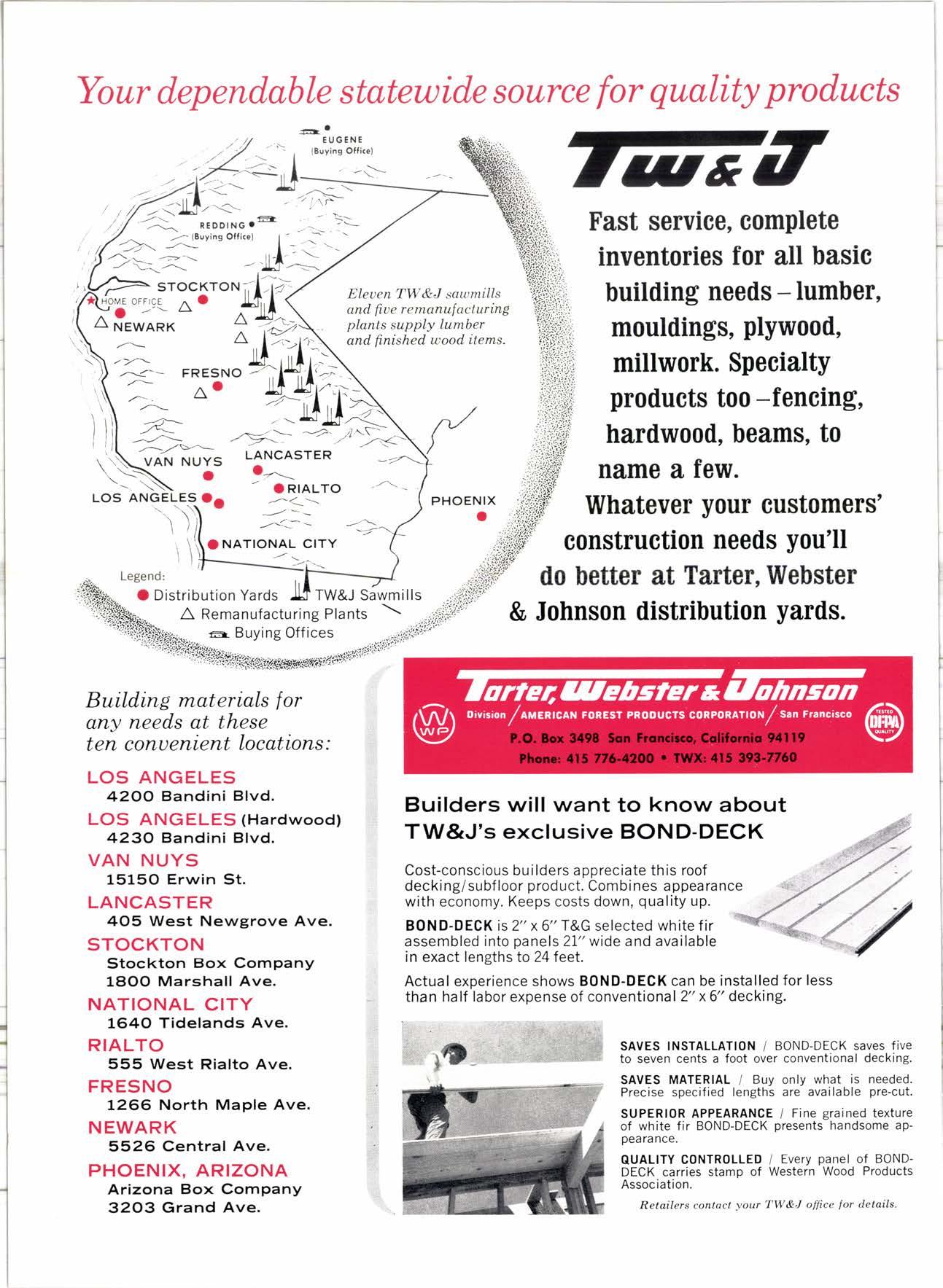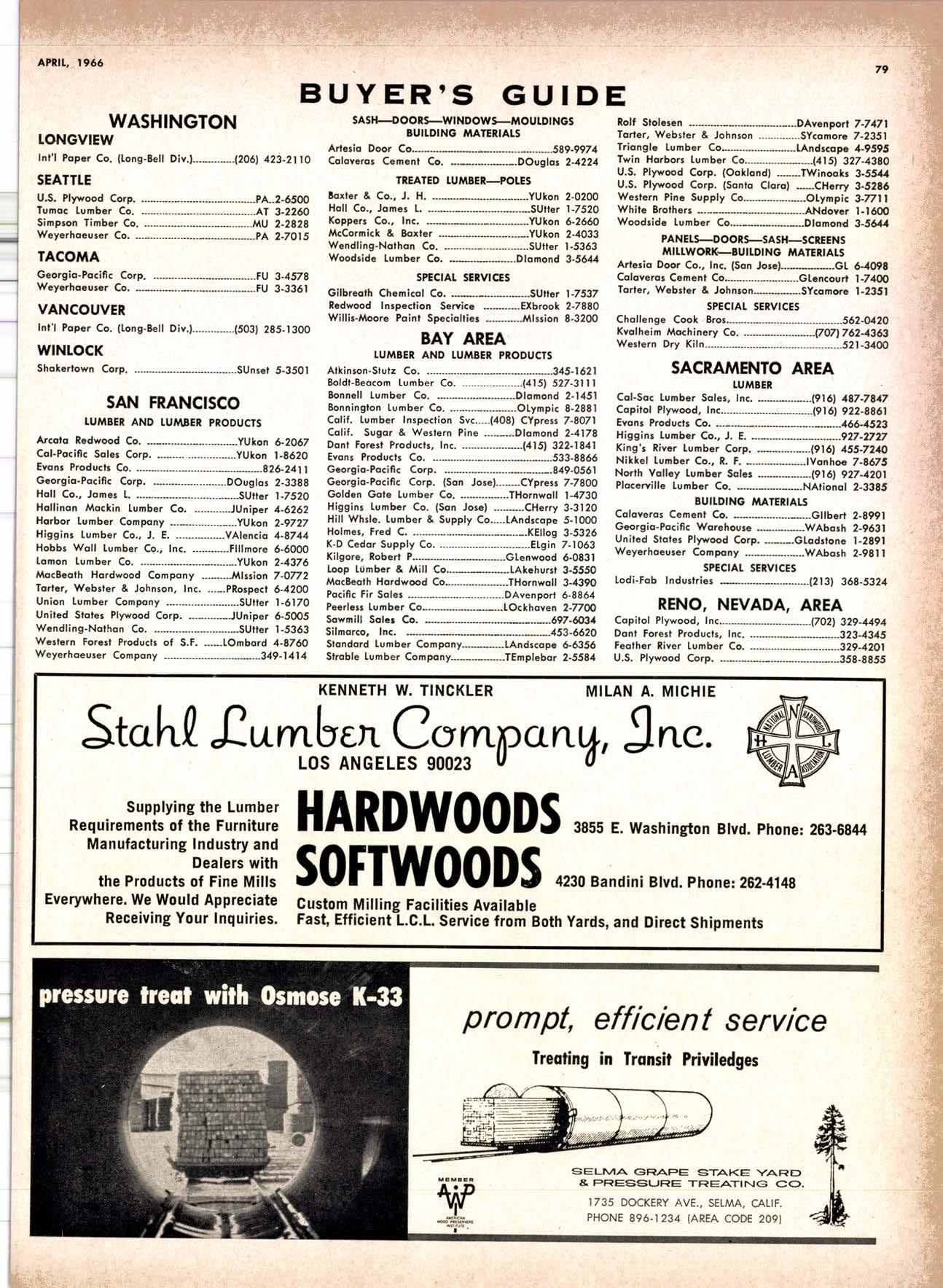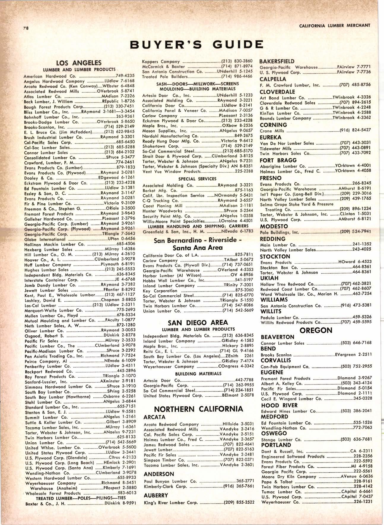 Kilgore, Roberf P.--.-.---.--------------G[enwood 6-083 I Loop lumbcr & AAill Co.--.--------.---[Alchurst 3-5550 A4ocBcoth Hqrdwood Co.--.----.-----.-----THornwoll 3-4390 Pociic Fir Soler .-----.---.-..-..-------------DA,venport 6-8864 Peerlcr Lurnbcr Co--.--------------------[Ockhoven 2-77d) Sowmill Solcr Co. ----------.--------697-5034 Silnorco, nc. ---------- ----153-6620 Stondord Lumber Compony-------.-lAndscope 6-6356 Stroble lumber Compony.-----------TEmplebor 2-5584 Roff Stolesen --..-..-DAvcnport 7-7171 Torter, Webster & Johnson .-.......-.--.SYcomorc 7-2351 Triongle Lunber Co..---.-......----..-...[Andccopc 4-959d Twin Horbors lumber Co,--...--.--..---------.(415) 327-4390 U.S. Plywood Corp. (Ooklondl -..---TWinooks 3-5544 U.S. Plyrood Corp. lSonto Clorct ----CHcrry 3-5286 Weslern Pinc Supply Co..---.--.----.---Slympic 3-7711 Whilc Brolhers -----.--ANdover l-l6d) Woodsidc lumber Co,.-.-----.--.---Dlornond 3-5644 PANEIS-DOORTSASII_SCREENS ftiltLWORK-lUltDl NG mArEnAtS Arlesio Door Co., Inc. lSon Josc)--------Gt 6.t098 Colqvcror Cemcnl Co.-..-....-..-----.---.Gtcncoutr. l-74;OO Torlcr, Wcbsler & Johnron-..--------SYcomore l-2351 SPECIAT SERVICES Chollenge Cook Bros...--".-- ---.562-A20 Kvof h ei m Moch inery Co. ..----.--.--..----- - -(7On 7 621369 Western Dry Kiln-...-.----.- --..-.--521-34fi1 SACRAMENTO AREA TUMBER Cql-Soc Lumbcr Soles, Inc. -...-.-------..-(9161 187-7817 Copilof Plywood, Inc..--.------.---.-------..---(91 61 922-8061 Evons Producls Co. -----..---------....-----.-.--.--466-4523 Higgins lunber Co., J. E. ....927.A27 King's River lumbcr Corp. -..-----.......-(9161 155-7210 Nikkef lumber Co., R. F. ---.-.--.-.----.lVonhoc 7-8675 North Volley tumbcr Solcr -...-----.....t916) 927-4201 Plocerville lunbcr Co. --*.-----.--.NAtionql 2.3385 BUItDING |TIATERIALS Coloveros Cemenl Co Gtlbcrt 2-8991 Georgio-Pocific Worchoulc ..-..-.---.-WAbosh 2-9631 United Sfofes Plyrood Corp. --.-.-.Gtodstone l-2891 Weyerhoeuscr Compony .-.--.----.-...WAbosh 2-98 I I SPECIAL SERVICES lodi-Fob lndurlries .-.-1213) 368-5324 RENO, NryADA, AREA Copilol Pf ywood, I nc.-..---..------. -- ------_. _l702l 329 - 49I Dont Forest Producls, Inc. .-..--.-------.- -------.---323-4315 Feolher River lumber Co. --_-329-l20l U.S. Plywood Corp. -----.----------.--.--.------------358-8855 KENNETH W. TINCKLER MILAN A. MICHIE Sto h tr fiuq,|yfg9,g,fp o nV, I r.'". Supplying the Lumber Requirements of the Furniture Manufacturing I ndustry and Dealers with the Products of Fine Mills Everyrvhere. We Would Appreciate Receiving Your Inquiries. HARDW00DS 38ss E. washington Brvd. phone: 26s.6844 SOFIWOODS 4230 Bandini Brvd. phone: 262.414s Gustom Milling Facilities Available Fast, Efficient L.C.L. Service from Both yards, and Direct Shipments .!i:l ' ;:1, i* it$ .i \;.i ' 'Jt':;1 ,- iii '.:.8 r{ r$ ,;u :;it€ *it ".rlri 'r'rli: ',!ls ..i5 'fi ,,, r. rt 'r:! s :r& .ll .,:!) ,r;:-rij *11 , ,ji! prompt, efficient service Ireoting in lronsit Priviledges SELTV|A GFIAPE S'TAKE YAFID & PF'ESSIJRE TREATING CO. 1735 DOCKERY AVE., SELMA, CALIF. PHONE 896-1234 (AREA CODE 2091