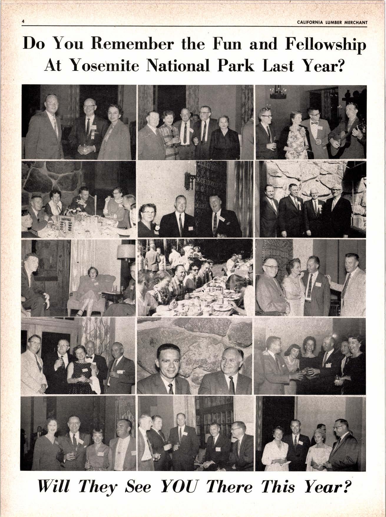 Lumber Merchants Assn. of Northern California (24 California St., San Francisco ll, Calif.) annual Convention, Ahwahnee hotel, Yosemite National Park, Apil 24-26.