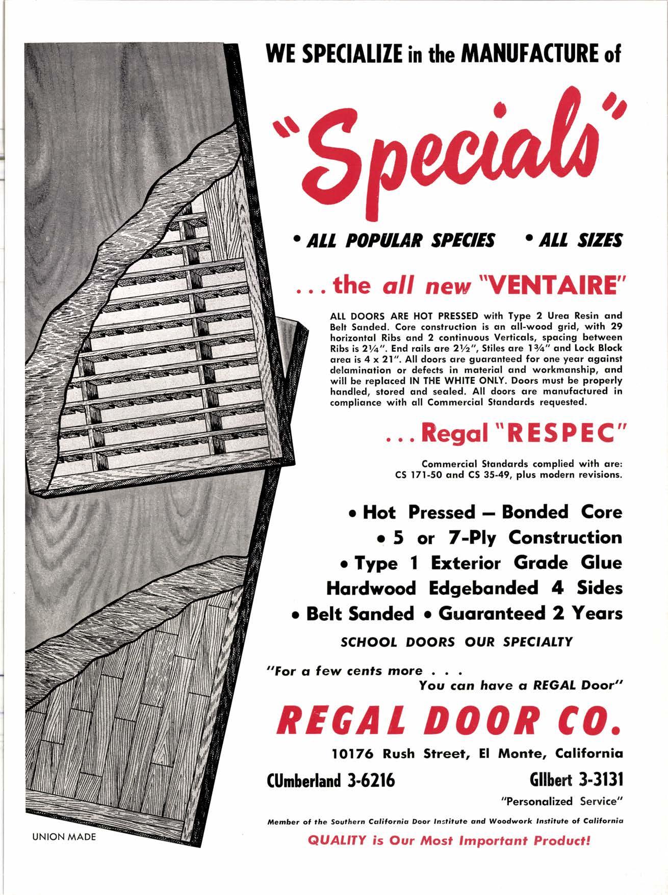 o Hot Pressed - Bonded Core o 5 or 7-Ply Construction o Type I Exterior Grqde Glue Hordwood Edgebonded 4 Sides 02 o Belt Sonded o Guoronteed 2 Yeors SCHOOI DOORS OUR SPEC'ALTY ttFor q tew cenfs mole . . You cq,n hcrve o REGAI Door" REGAL DOOR CO. 10176 R.ush Street, El Monle, Colifornio CUnbedand 3.6216 Gllbert 3-3131 "Personolized Service" Member of the Southern Cslilornia Door ,nstitule ond Woodwork lnstit.tle ol Calilornia QUA[|TY is Our Most lmportont Product! UNION MADE