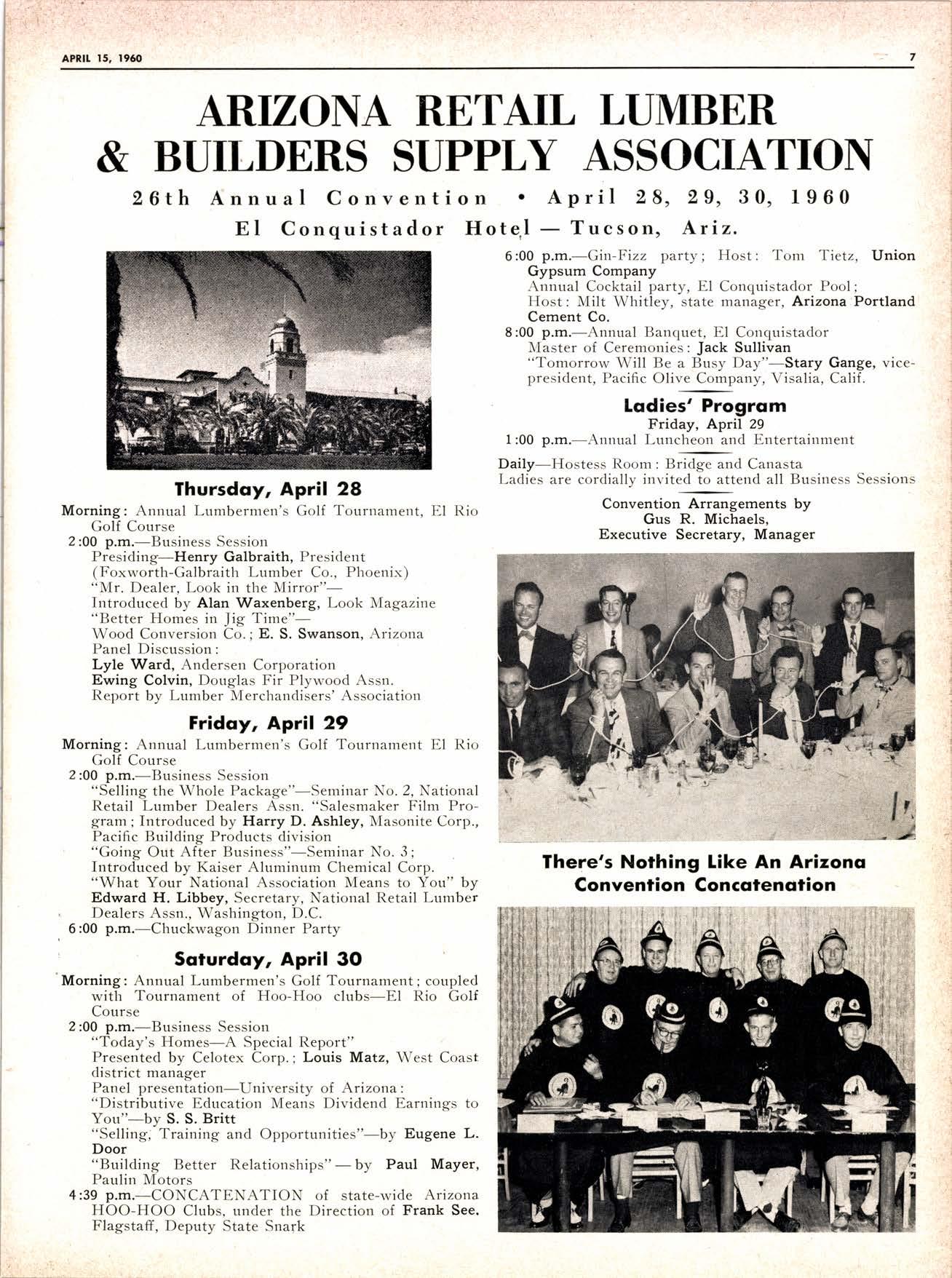 Arizona Retail Lumber & Builders Supply Assn. (47{0 \ Central Ave., Phoenix, Ariz.) annual Convention, El Conquistador, Tucson, April 28-30.