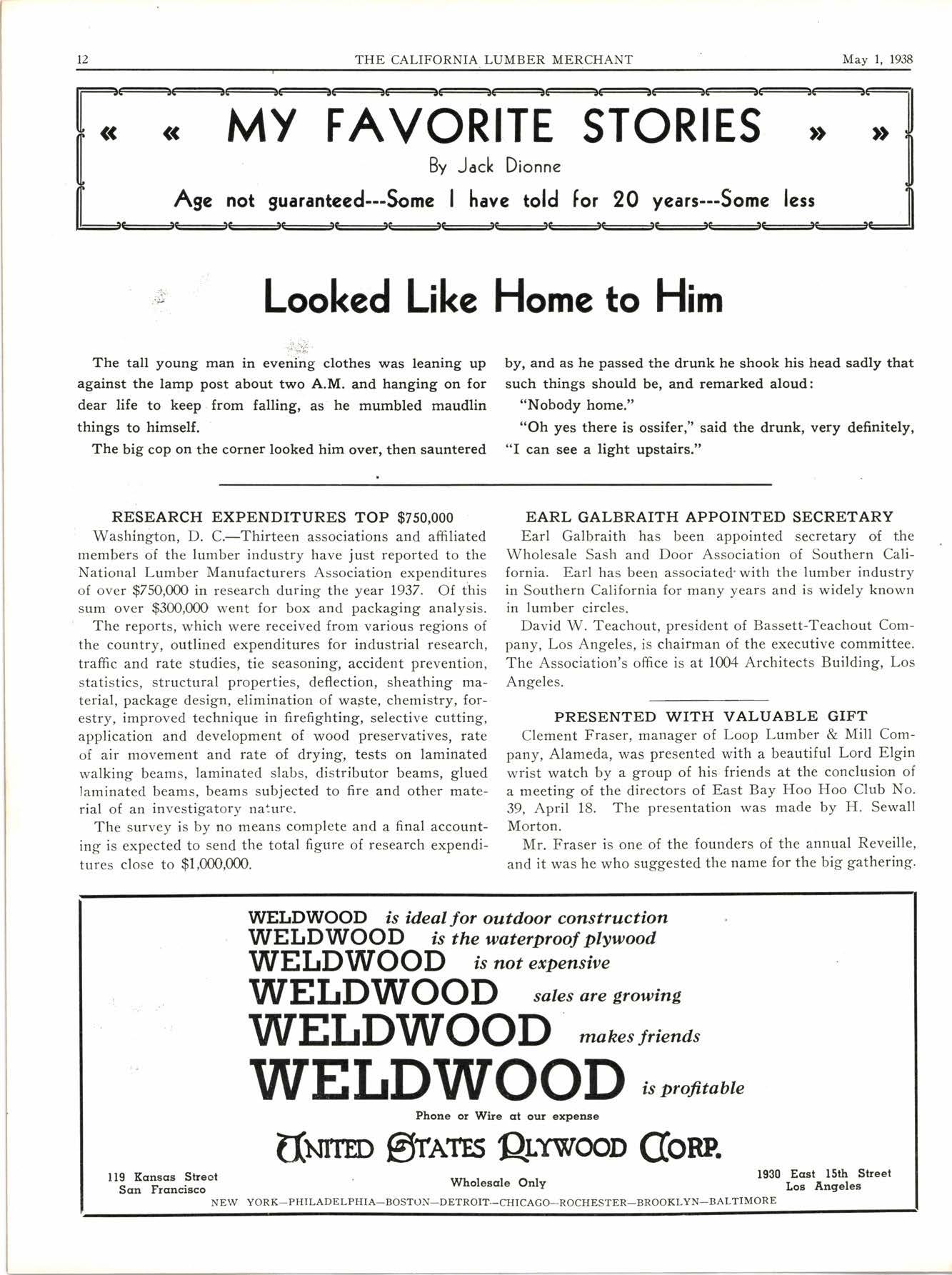 Clement Fraser, manag'er of Loop Lumber & Mill Company, Alameda, was presented with a beautiful Lord Elgin wrist watch by a group of his friends at the conclusion of a meeting of the directors of East Bay Hoo Hoo Club No. 39, April 18. The presentation was made by H. Sewall Morton.